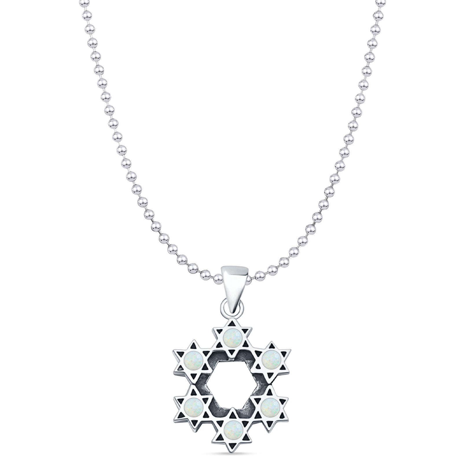 Round Lab Created White Opal Stars Pendant Bead Chain Necklace Oxidized 925 Sterling Silver