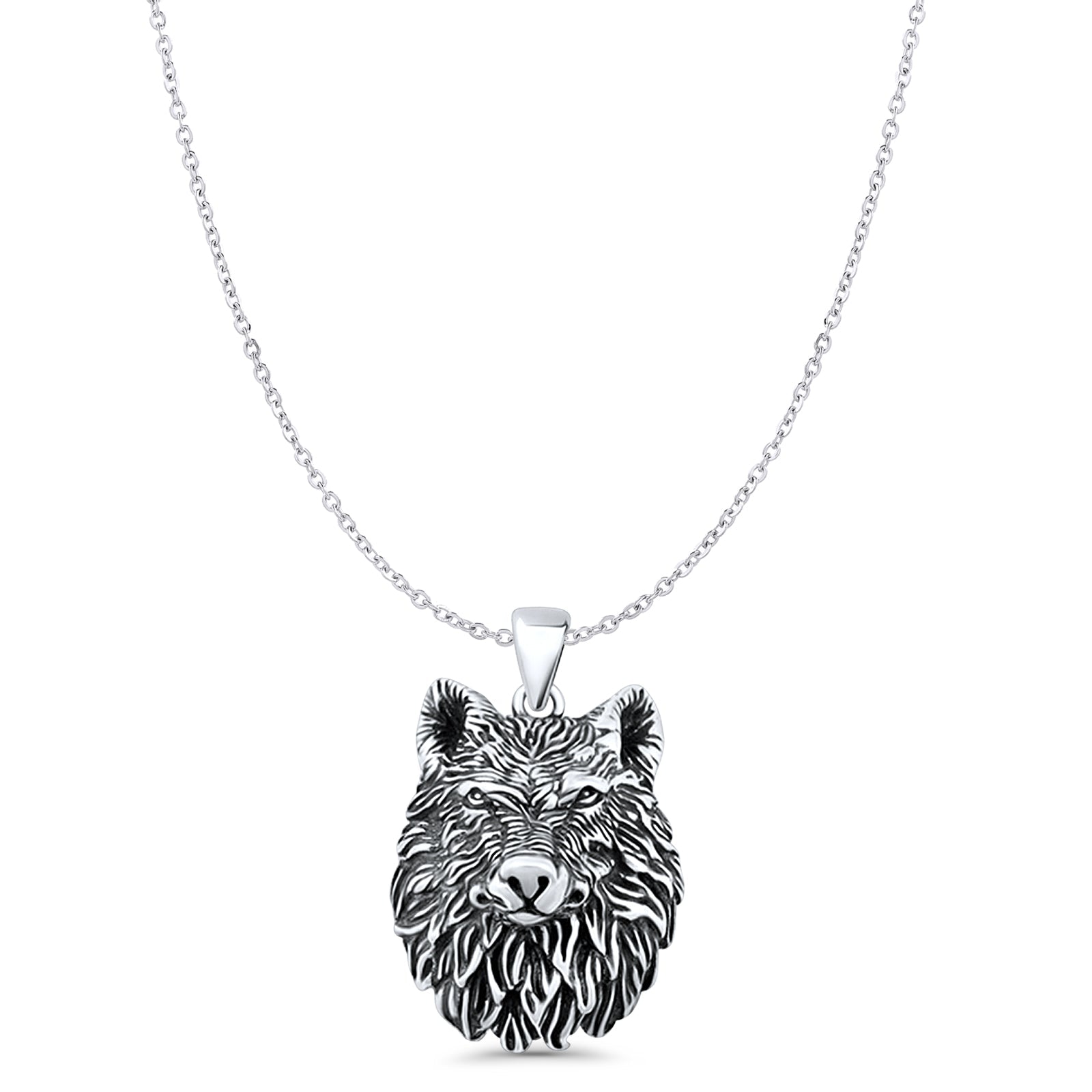Wolf Head Charm Pendant Cable Chain Necklace Oxidized 925 Sterling Silver