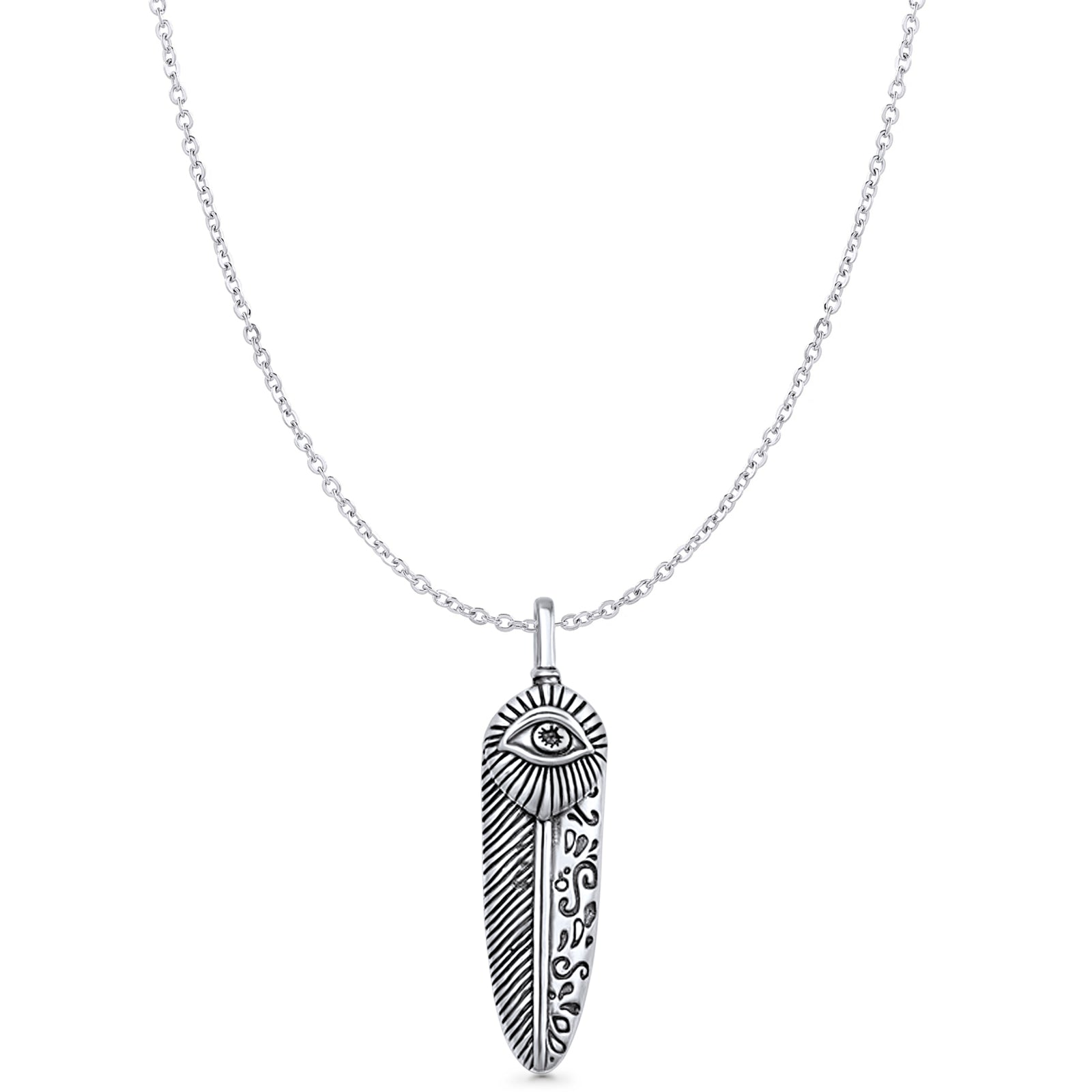 Feather & Evil Eye Pendant Cable Chain Necklace Oxidized 925 Sterling Silver