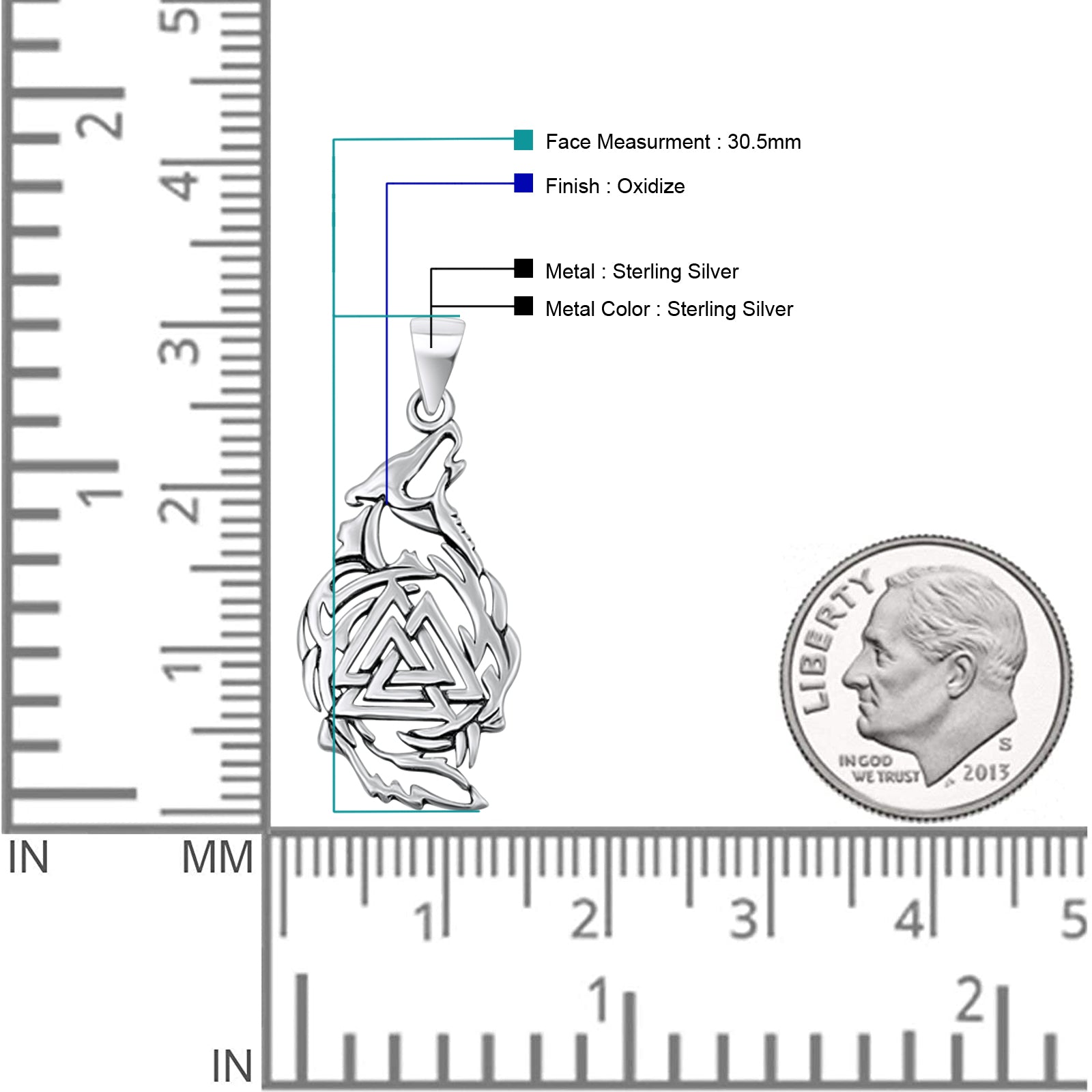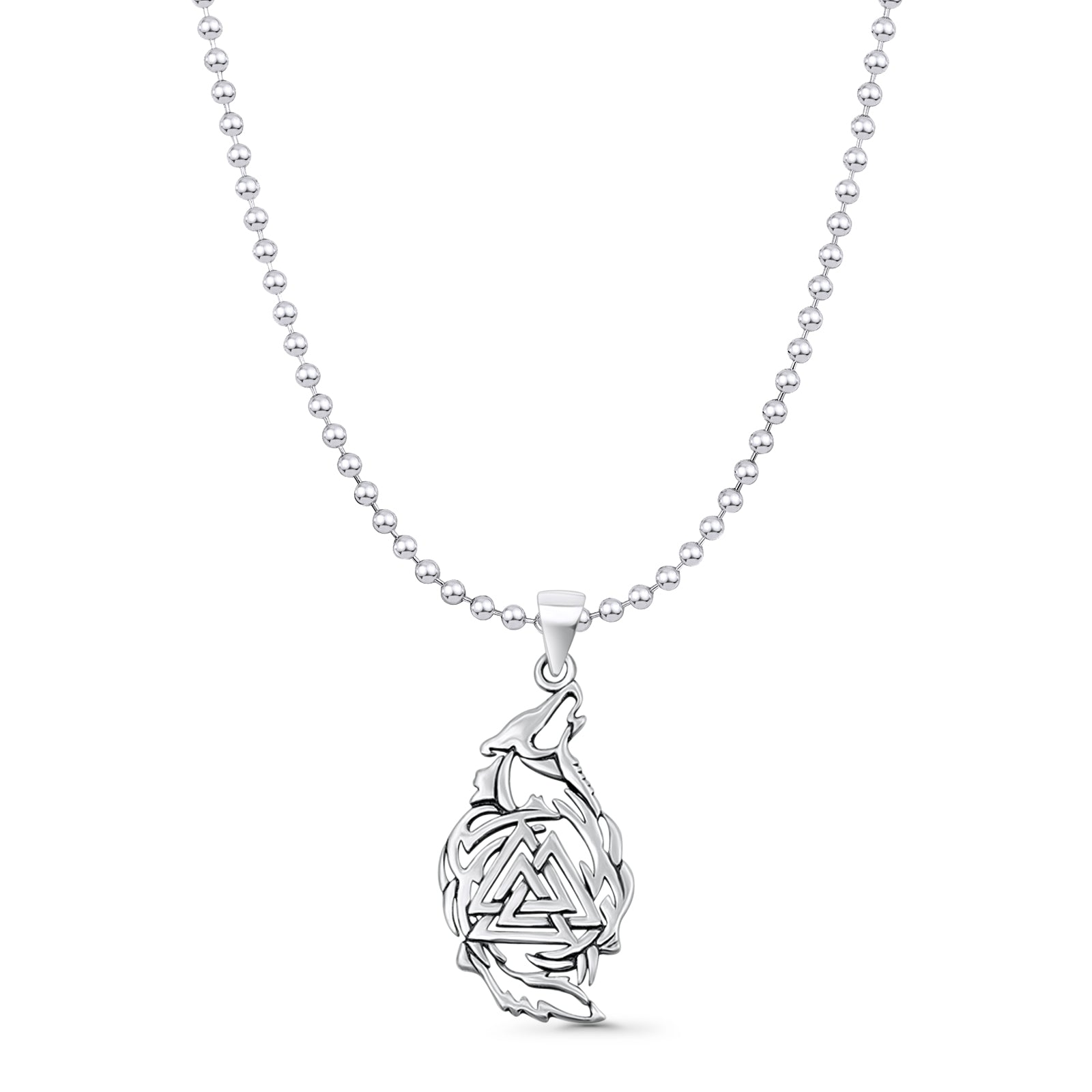 Valknut & Wolf Pendant Bead Chain Necklace Oxidized 925 Sterling Silver