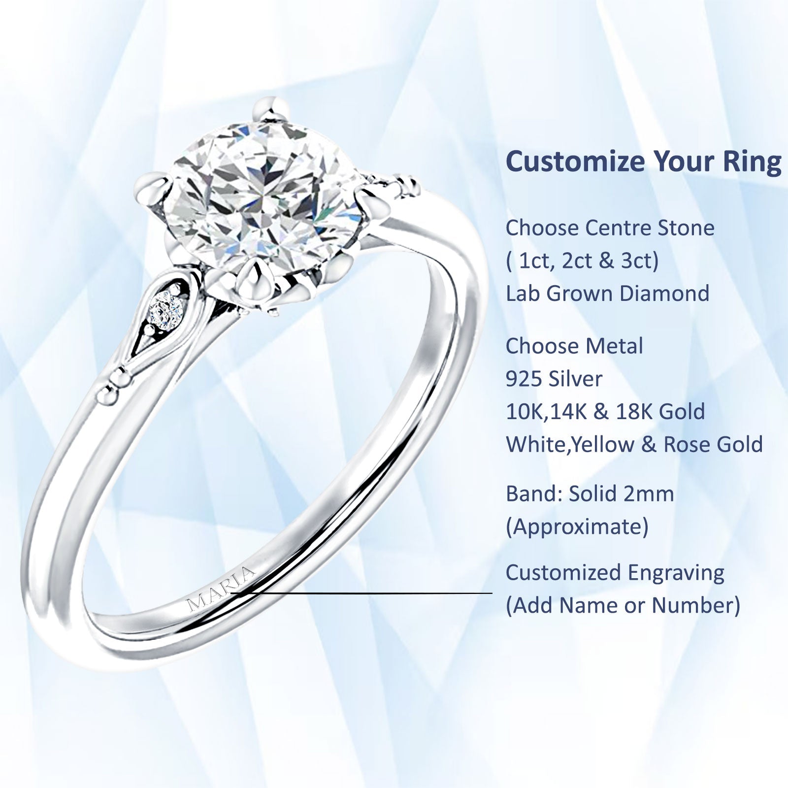 This lab grown diamond ring is available in three different carat weights and also comes in a choice of various metal types.(Tarnish Resistant Sterling Silver, 14K Gold & 18K Gold)