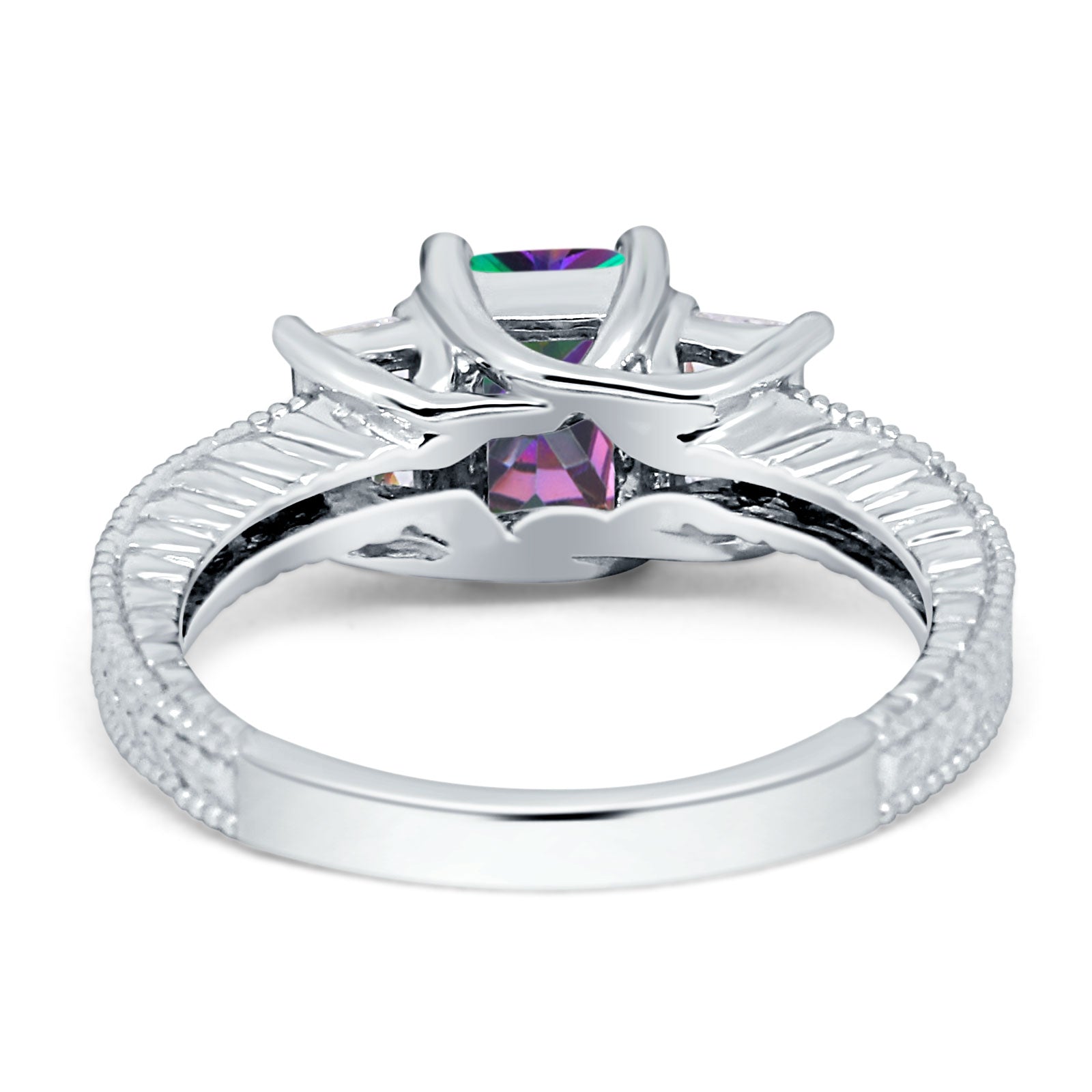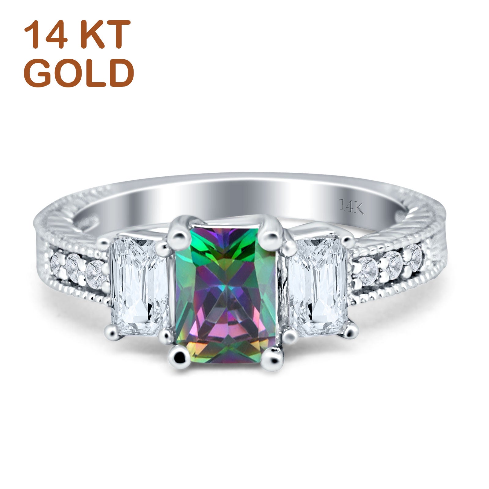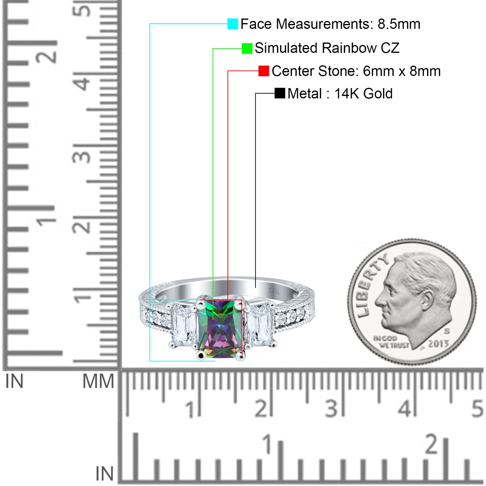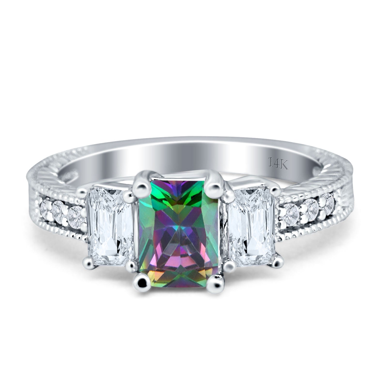 14K White Gold Three Stone Round & Emerald Cut Rainbow CZ Milgrain Ring