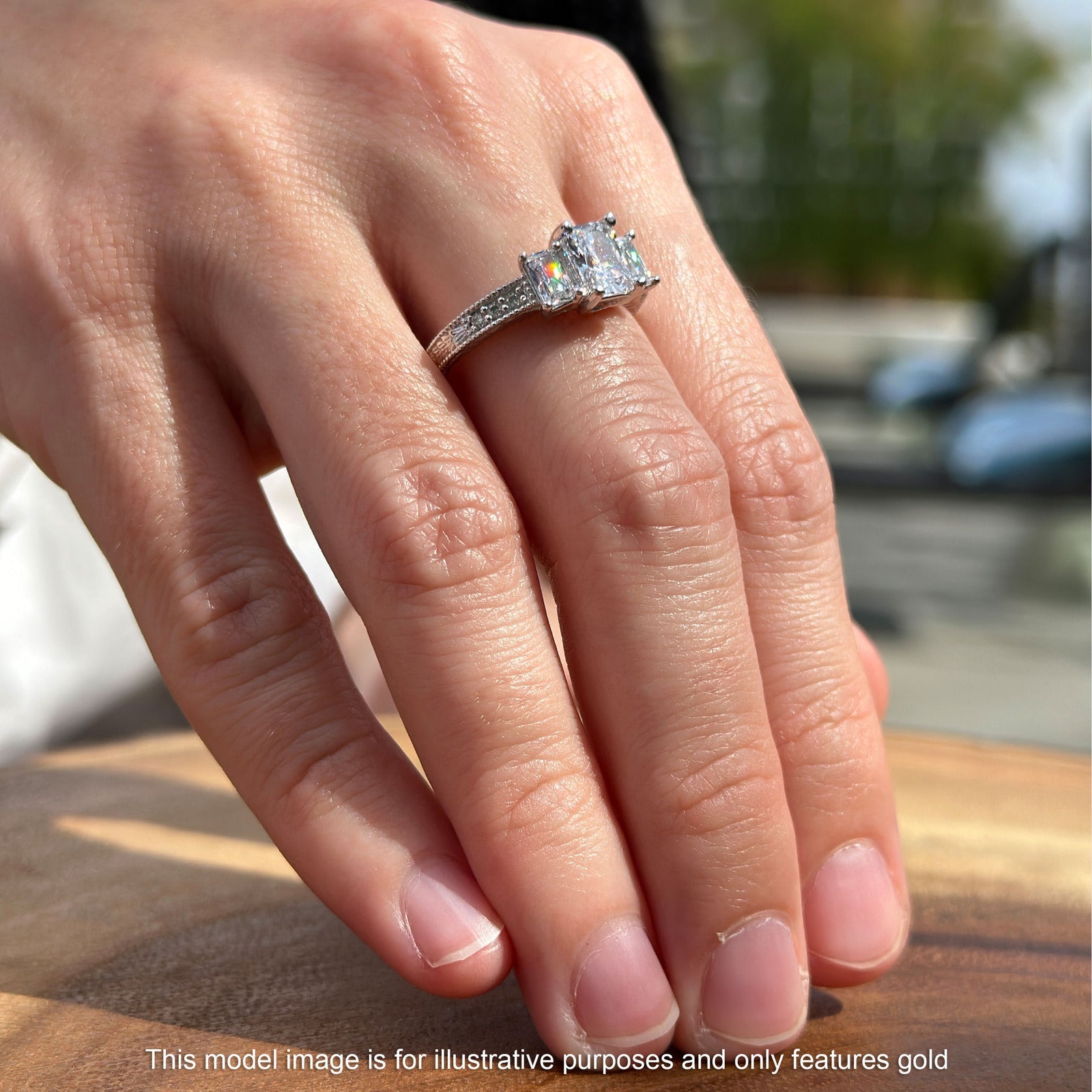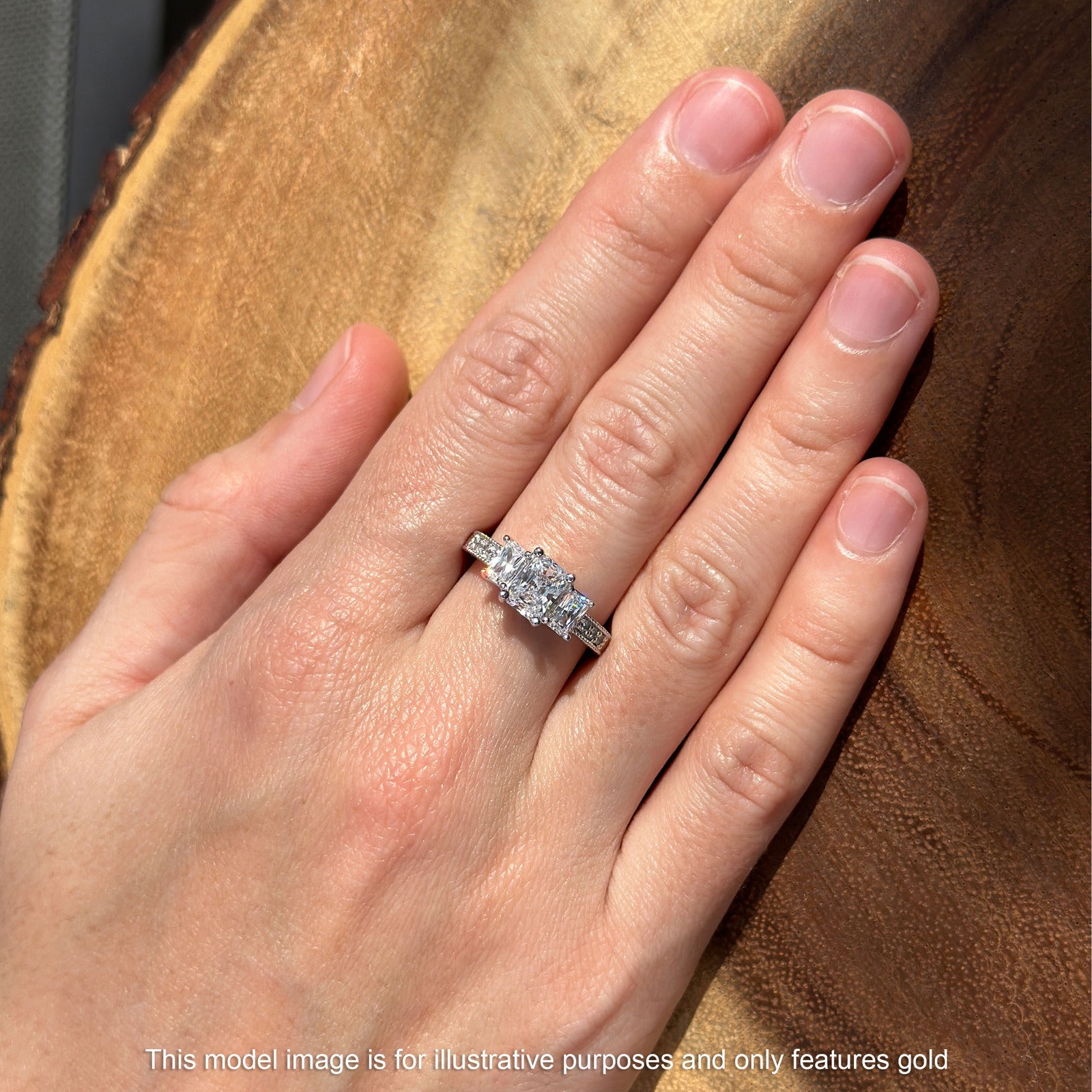 Ring Type: Three Stone Round & Emerald Cut Gold Ring.