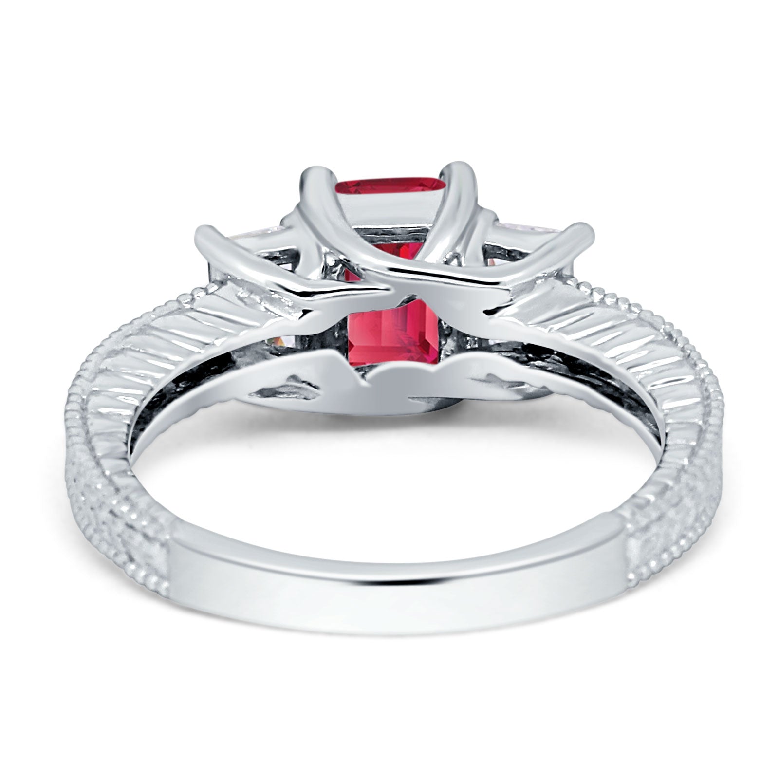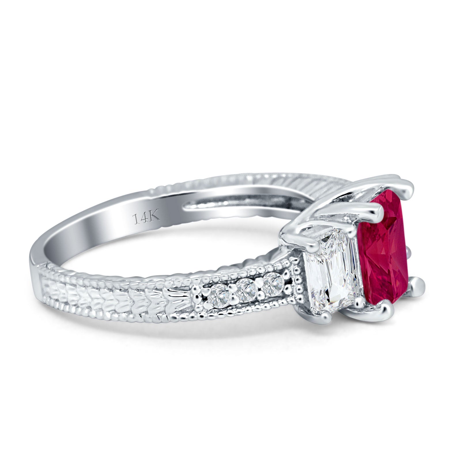 14K White Gold Three Stone Round & Emerald Cut Ruby CZ Milgrain Ring