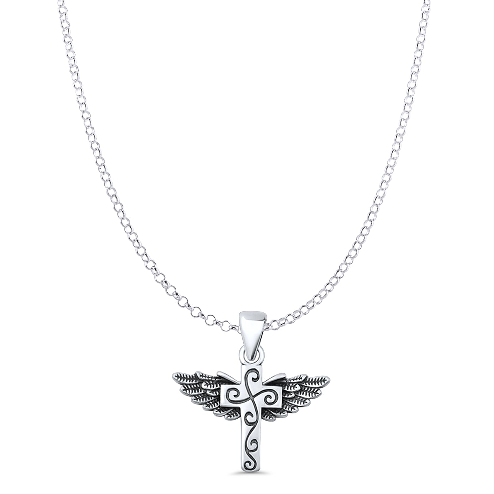 Cross & Wings Charm Pendant Rolo Chain Necklace Oxidized 925 Sterling Silver
