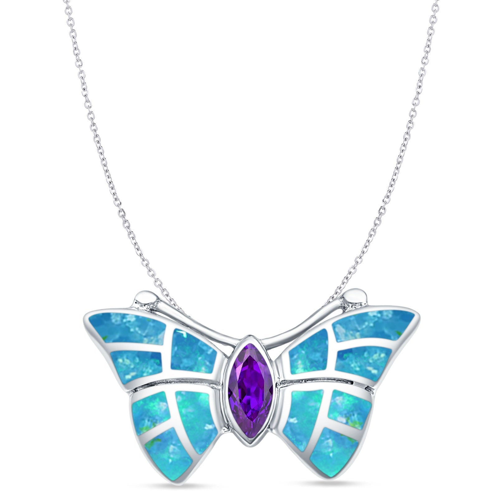 Style: Lab Created Blue Opal & Amethyst CZ Butterfly Pendant Necklace
