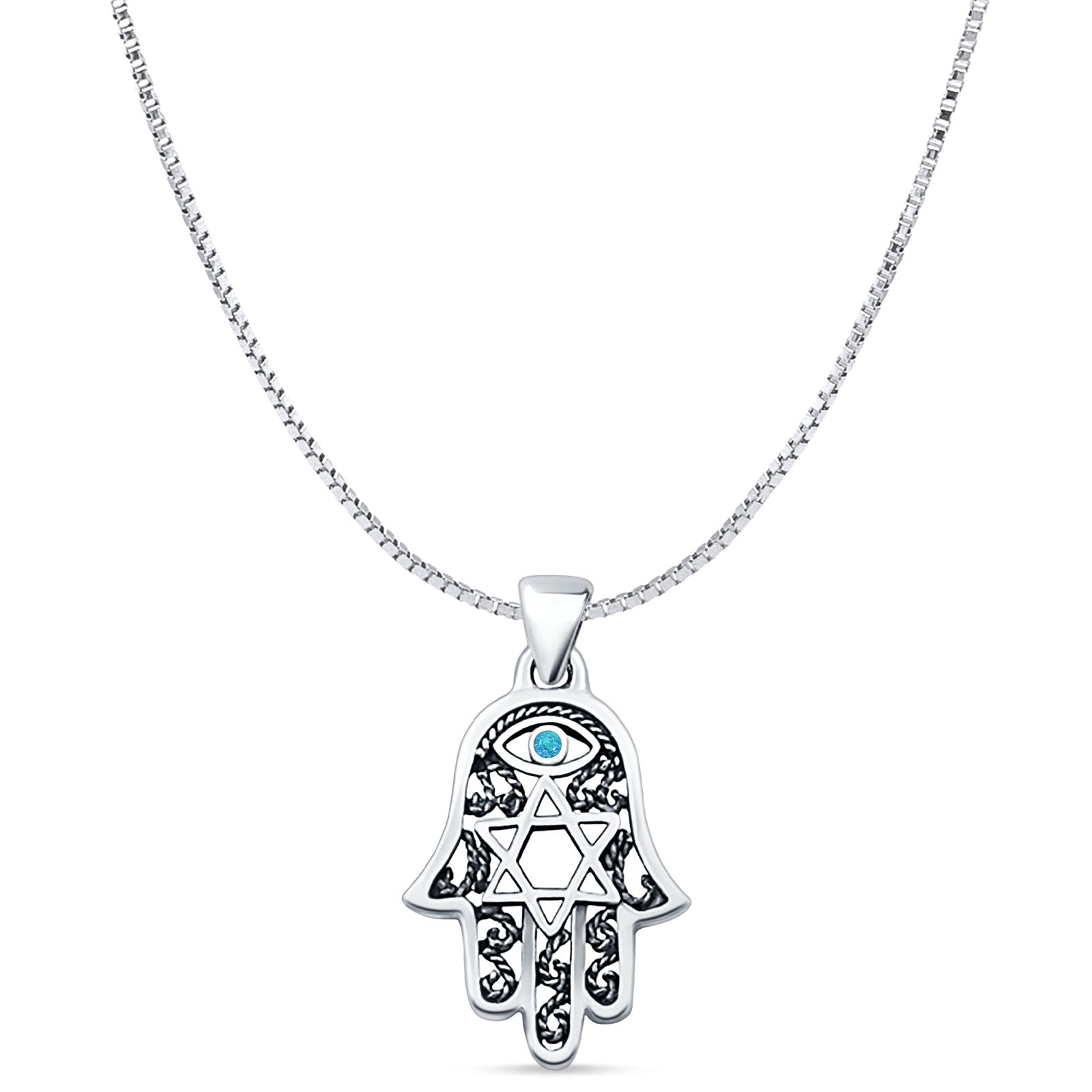 Lab Created Blue Opal Hamsa & Star Of David Pendant Box Chain Necklace Oxidized 925 Sterling Silver
