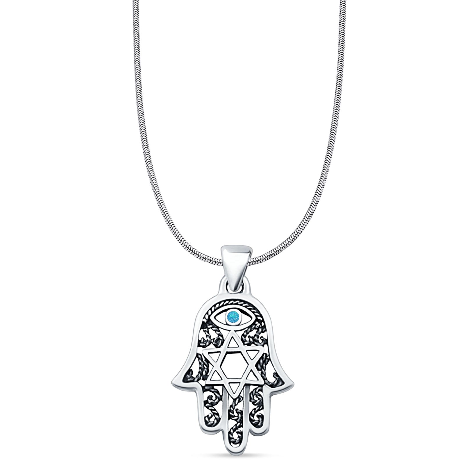 Lab Created Blue Opal Hamsa & Star Of David Pendant Snake Chain Necklace Oxidized 925 Sterling Silver