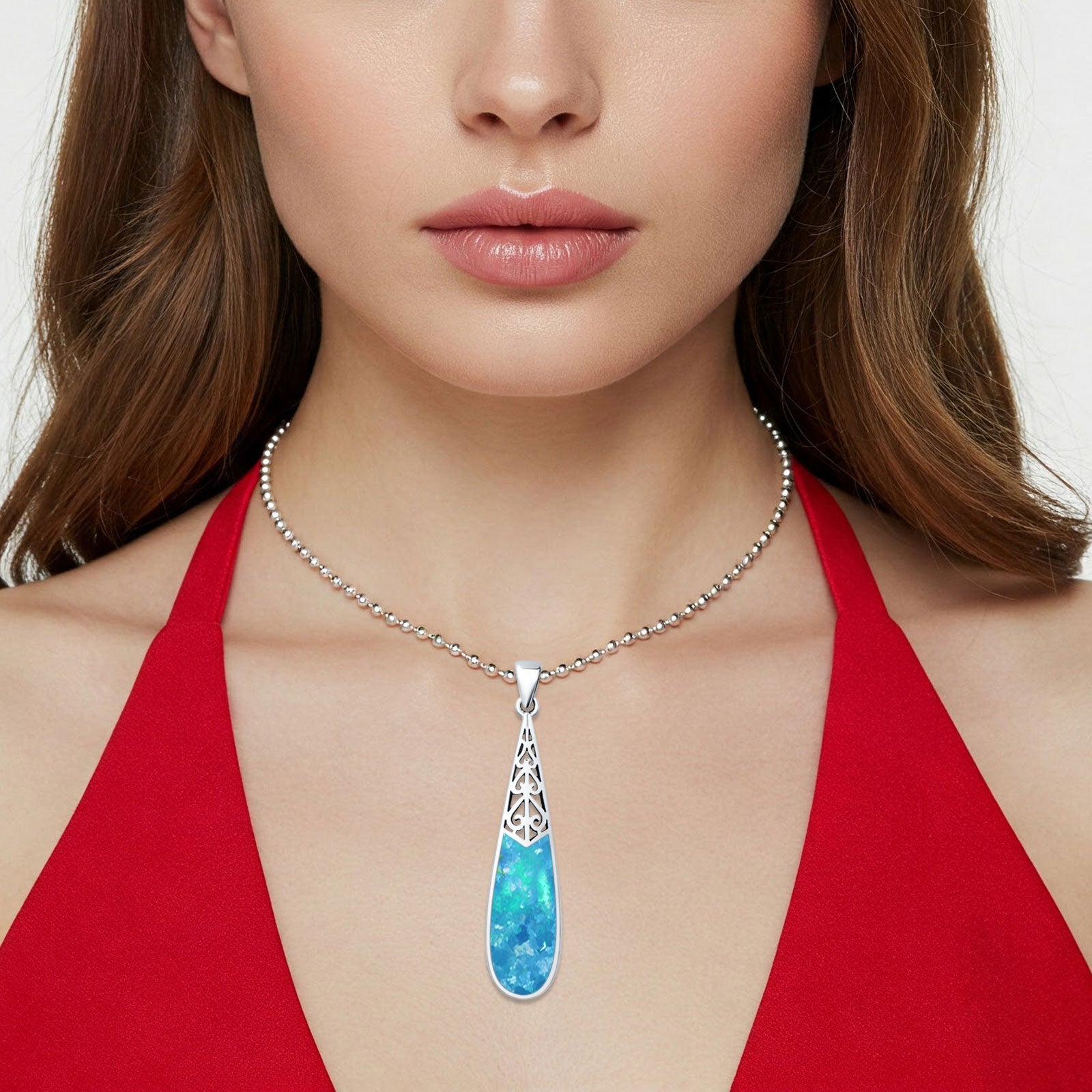 Style: Oxidized Lab Created Blue Opal Pear Dangle Drop Pendant
