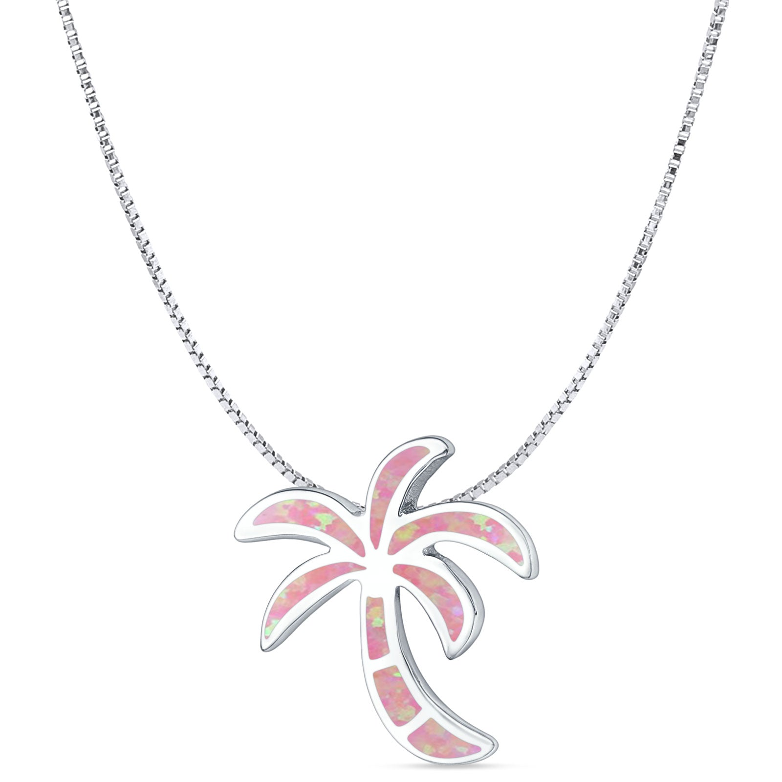 Lab Created Pink Opal Plam Tree Pendant Box Chain Necklace 925 Sterling Silver