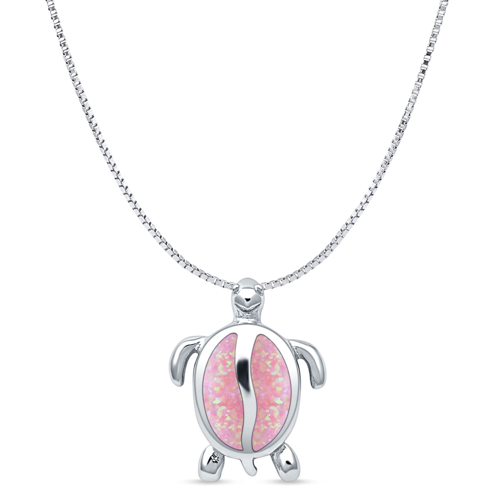 Lab Created Pink Opal Turtle Pendant Box Chain Necklace 925 Sterling Silver