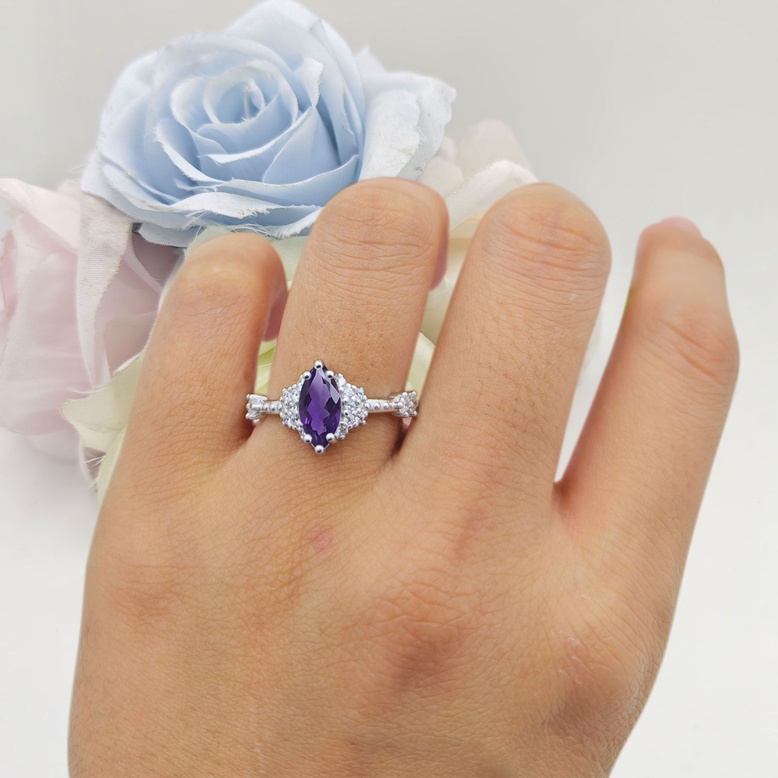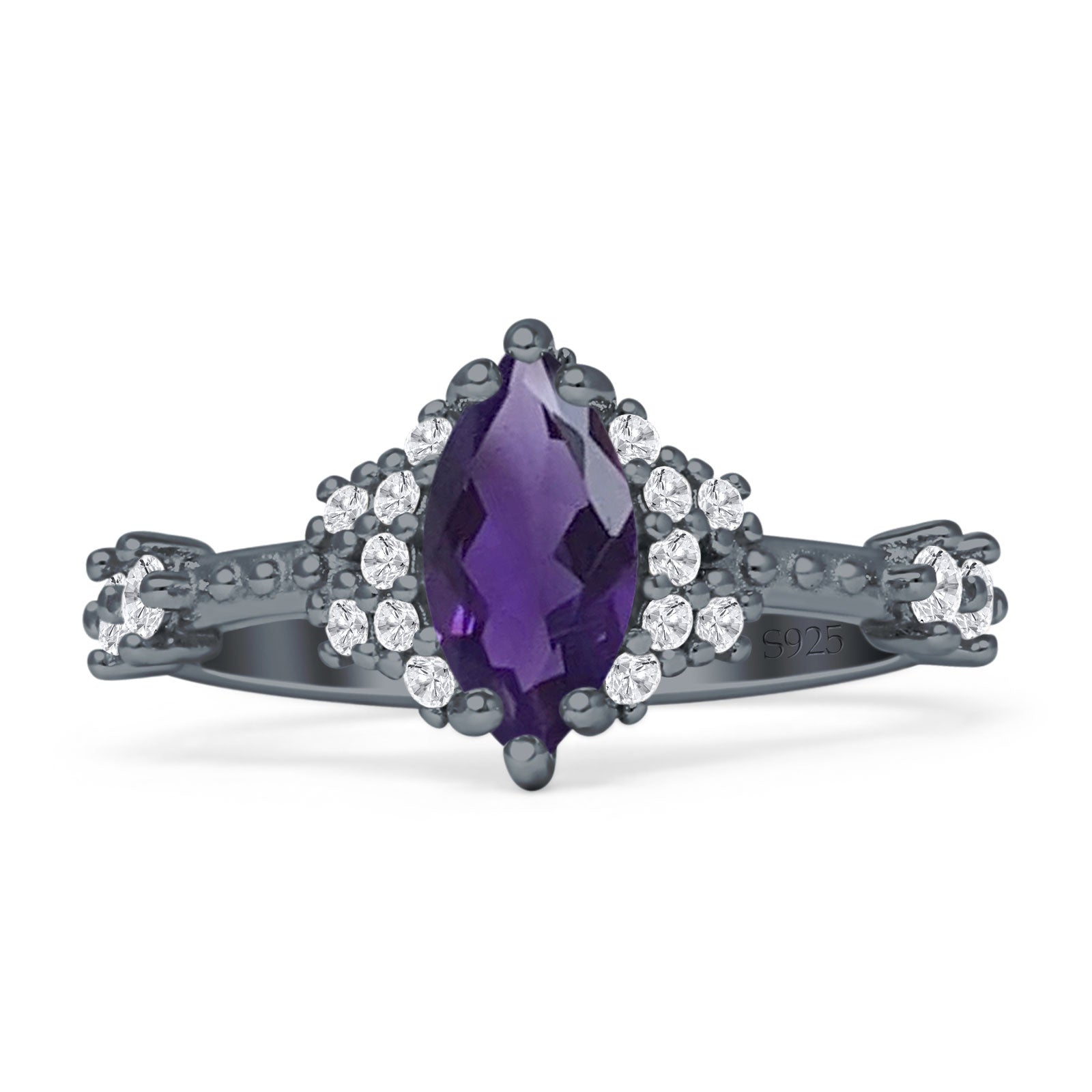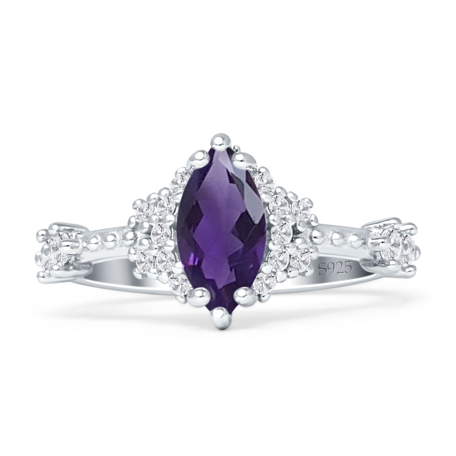 Product Description:The "marquise natural Amethyst halo beaded ring" is a celebration of sophistication in 925 sterling silver. Featuring a stunning marquise-cut Amethyst, this ring is encircled by a halo of meticulously crafted beads, accentuating the gemstone’s tranquil blue. The sterling silver band, adorned with its own beaded details, complements the centerpiece, making this ring a timeless choice for those who appreciate the fine artistry of the past with the shine of the present.