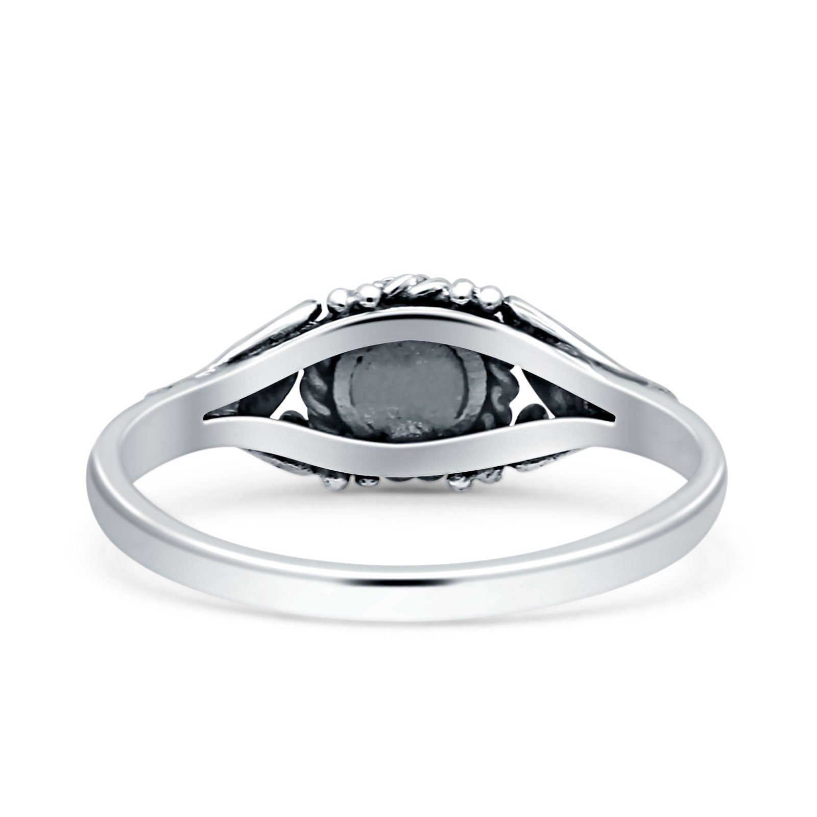 Minimalist 6mm Lab Created White Opal Twisted Rope & Leaf Oxidized Ring 925 Sterling Silver