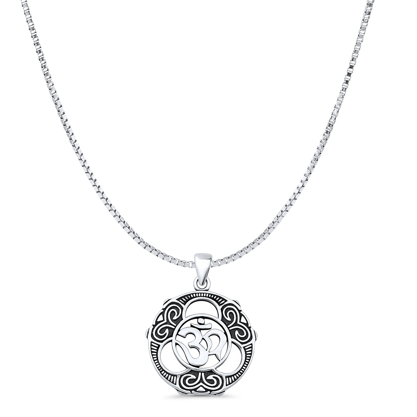 Om Pendant Oxidized Box Chain Necklace 925 Sterling Silver