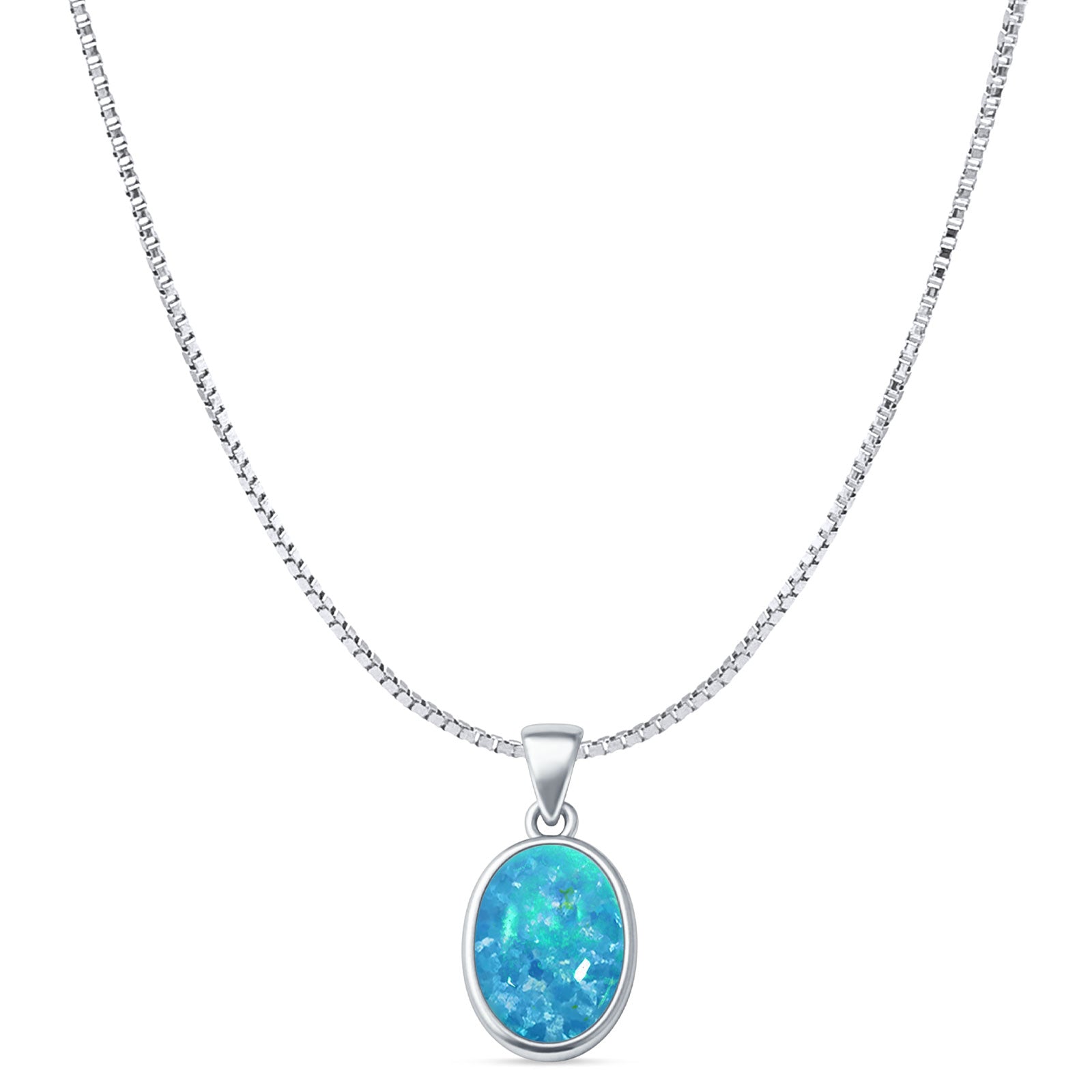Oval Lab Created Blue Opal Solitaire Pendant Box Chain Necklace 925 Sterling Silver