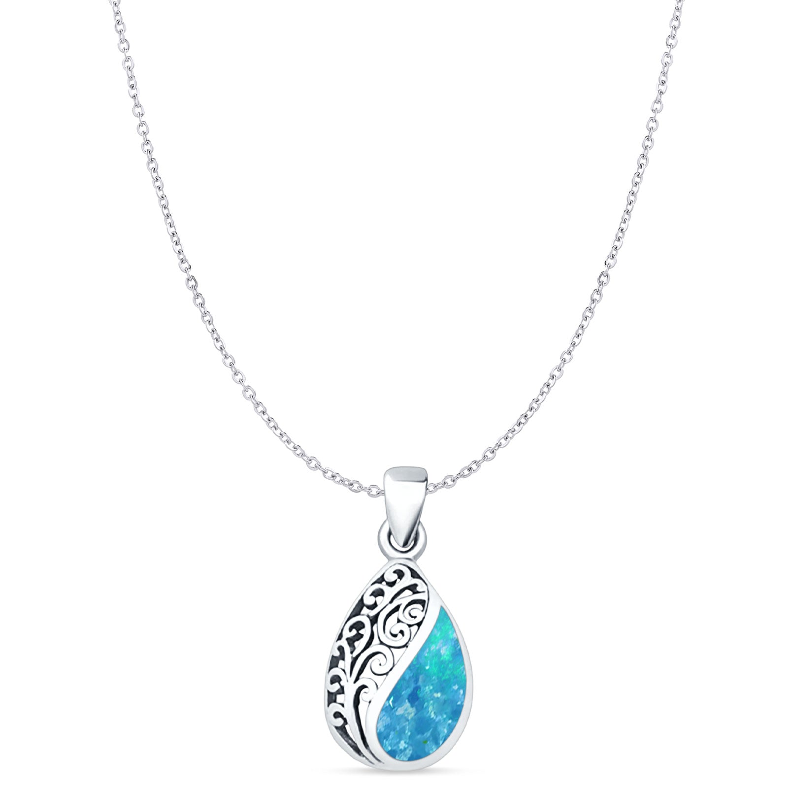 Pear Lab Created Blue Opal Filigree Pendant Oxidized Cable Chain Necklace 925 Sterling Silver