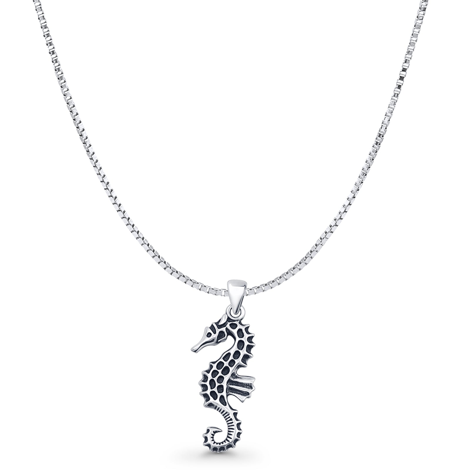 Seahorse Pendant Box Chain Necklace Oxidized 925 Sterling Silver