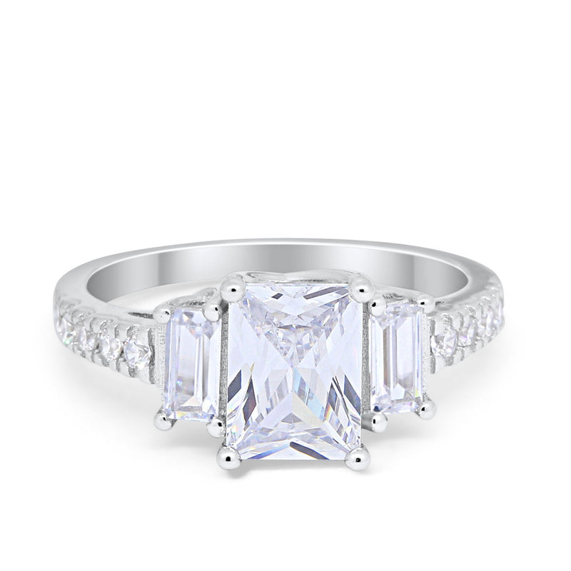 Emerald Cut Engagement Ring Round Simulated Cubic Zirconia 925 Sterling Silver