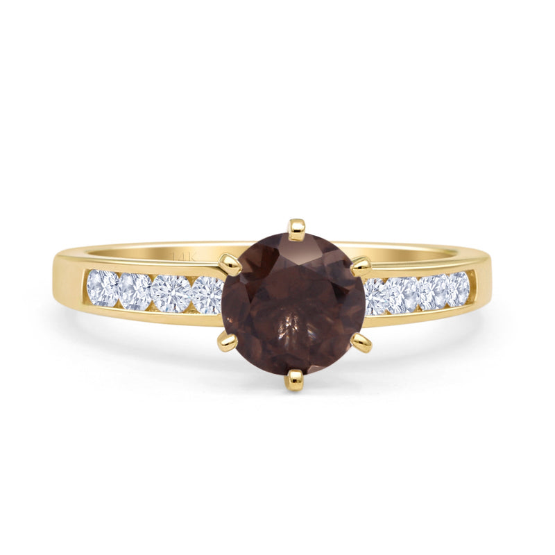 Natural Chocolate Smoky Quartz Engagement RingMetal Type: 14K Yellow Gold.Metal Stamp or Hallmark: 14K.Gemstone: Natural Chocolate Smoky Quartz.Gemstone Creation Method: Natural.Side Stone: Cubic Zirconia(CZ).Face Measurements From South To North: 6.5mm(0.25inch)Center Stone Measurements: 6.5mm(0.25").Approximate Center Stone Carat Weight: 1.03Carat.Features:-14K Yellow Gold.-Round...