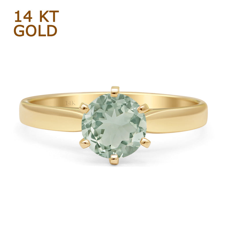 Natural Green Amethyst Prasiolite Engagement RingMetal Type: 14K Yellow Gold.Metal Stamp or Hallmark: 14K.Gemstone: Natural Green Amethyst Prasiolite.Gemstone Creation Method: Natural.Side Stone: Cubic Zirconia(CZ).Face Measurements From South To North: 6.5mm(0.25inch)Center Stone Measurements: 6.5mm(0.25").Approximate Center Stone Carat Weight: 1.03Carat.Features:-14K Yellow Gold.-Round...