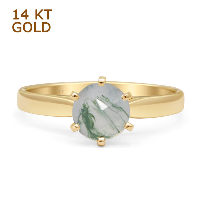 Natural Green Moss Agate Engagement RingMetal Type: 14K Yellow Gold.Metal Stamp or Hallmark: 14K.Gemstone: Natural Green Moss Agate.Gemstone Creation Method: Natural.Side Stone: Cubic Zirconia(CZ).Face Measurements From South To North: 6.5mm(0.25inch)Center Stone Measurements: 6.5mm(0.25").Approximate Center Stone Carat Weight: 1.03Carat.Features:-14K Yellow Gold.-Round...