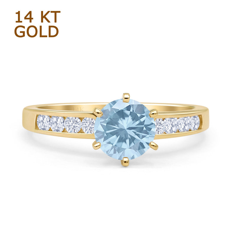 Natural Aquamarine Engagement RingMetal Type: 14K Yellow Gold.Metal Stamp or Hallmark: 14K.Gemstone: Natural Aquamarine.Gemstone Creation Method: Natural.Side Stone: Cubic Zirconia(CZ).Face Measurements From South To North: 6.5mm(0.25inch)Center Stone Measurements: 6.5mm(0.25").Approximate Center Stone Carat Weight: 1.03Carat.Features:-Solid 14K Yellow Gold.-Round Natural Aquamarine Gemstone.-Cathedral...