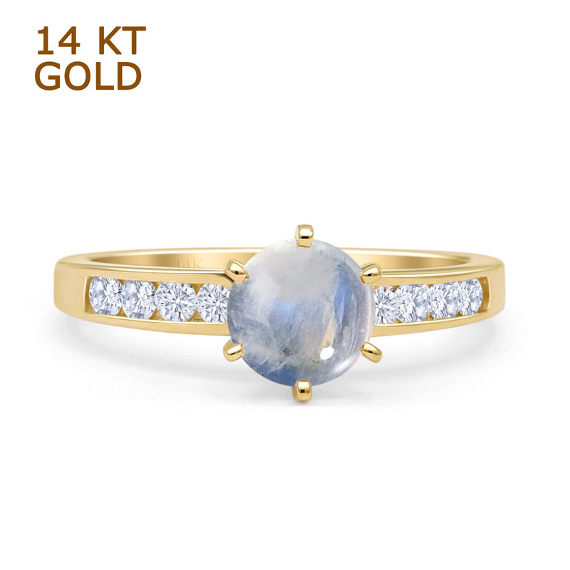 Natural Moonstone Engagement RingMetal Type: 14K Yellow Gold.Metal Stamp or Hallmark: 14K.Gemstone: Natural Moonstone.Gemstone Creation Method: Natural.Side Stone: Cubic Zirconia(CZ).Face Measurements From South To North: 6.5mm(0.25inch)Center Stone Measurements: 6.5mm(0.25").Approximate Center Stone Carat Weight: 1.03Carat.Features:-Solid 14K Yellow Gold.-Round Natural Moonstone Gemstone.-Cathedral...