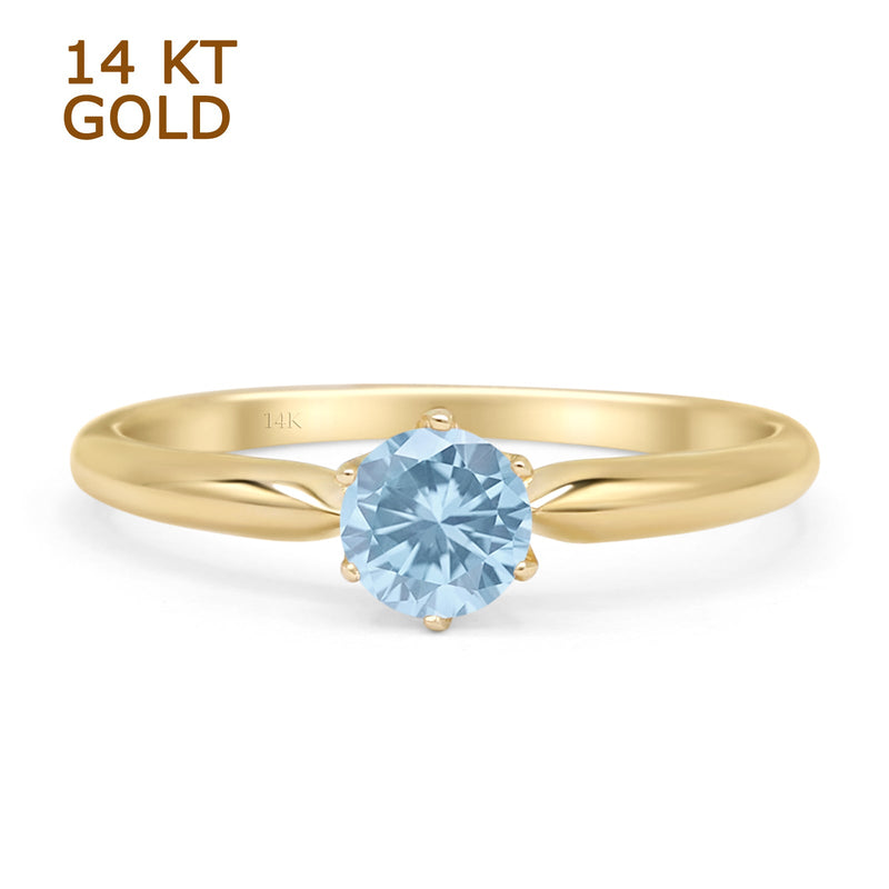 Natural Aquamarine Engagement RingMetal Type: 14K Yellow Gold.Metal Stamp or Hallmark: 14K.Gemstone: Natural Aquamarine.Gemstone Creation Method: Natural.Side Stone: Cubic Zirconia(CZ).Face Measurements From South To North: 6.5mm(0.25inch)Center Stone Measurements: 6.5mm(0.25").Approximate Center Stone Carat Weight: 1.03Carat.Features:-14K Yellow Gold Setting.-Petite Dainty Design.-Round Solitaire...