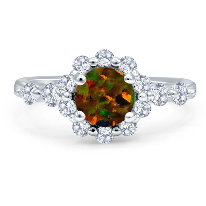 Item Specifications: Metal Type: Sterling Silver.Metal Stamp or Hallmark: .925Metal Purity: 92.5% Sterling.Gemstone Creation Method: Lab CreatedFace Measurements From South To North: 10.4mm(0.40inch)Center Stone Measurement: 6mm(0.23") Gemstone: Lab Created Black Opal. Ring Design: Round Lab Created Black Opal Floral Ring.