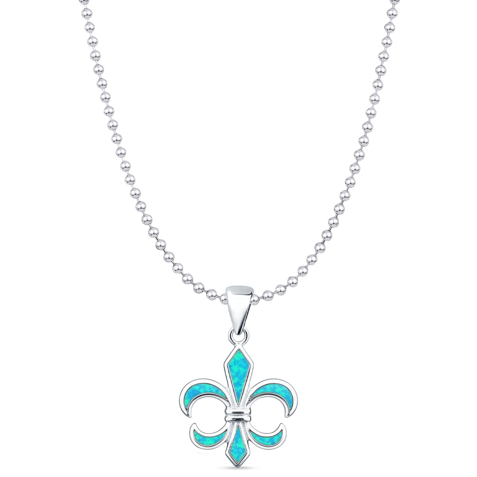 Lab Created Blue Opal Fleur De Lis Pendant Bead Chain Necklace 925 Sterling Silver
