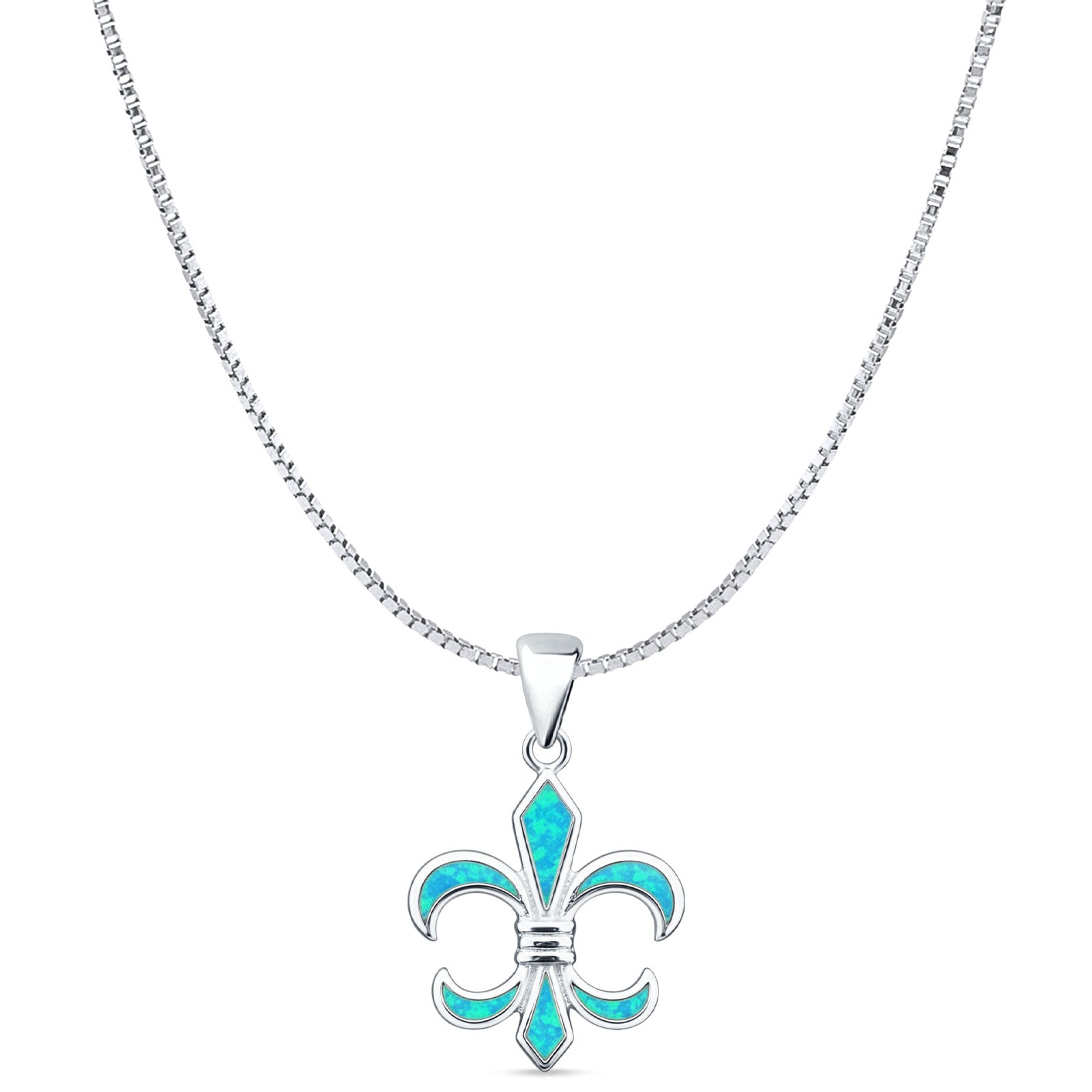 Lab Created Blue Opal Fleur De Lis Pendant Box Chain Necklace 925 Sterling Silver
