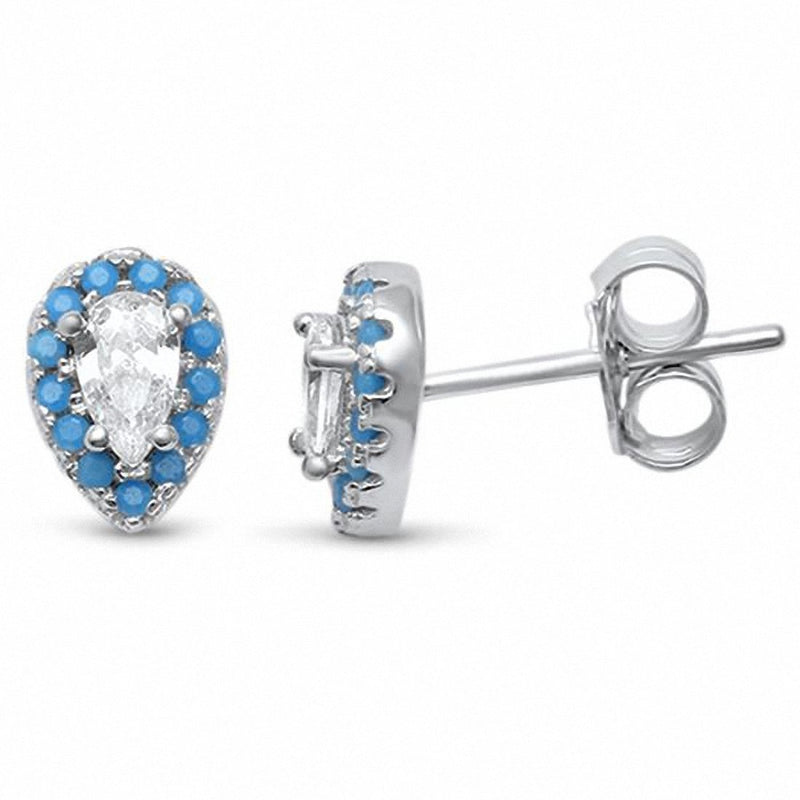 Halo Teardrop Bridal Stud Earrings Simulated Turquoise Round CZ 925 Sterling Silver