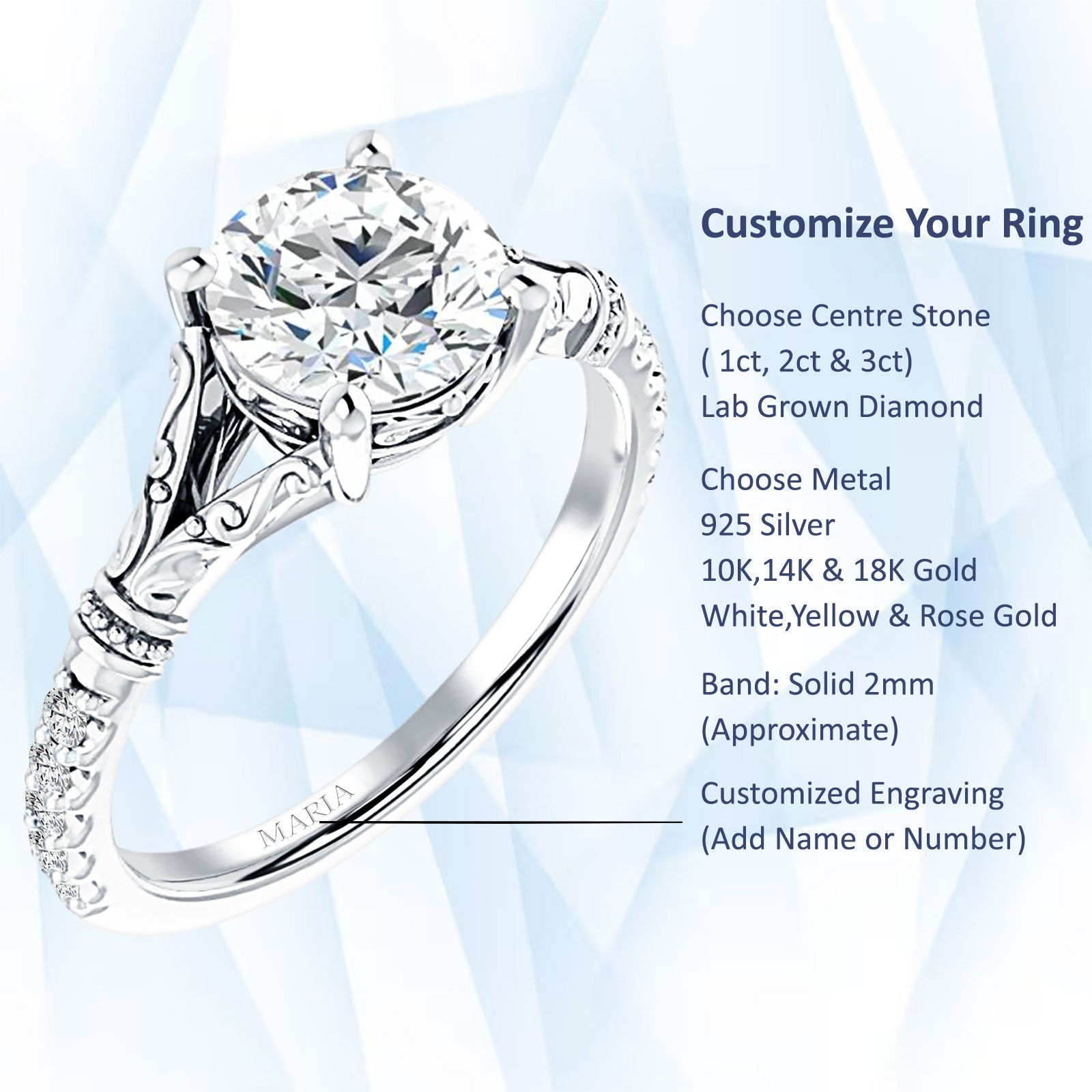 This lab grown diamond ring is available in three different carat weights and also comes in a choice of various metal types.(Tarnish Resistant Sterling Silver, 14K Gold & 18K Gold)