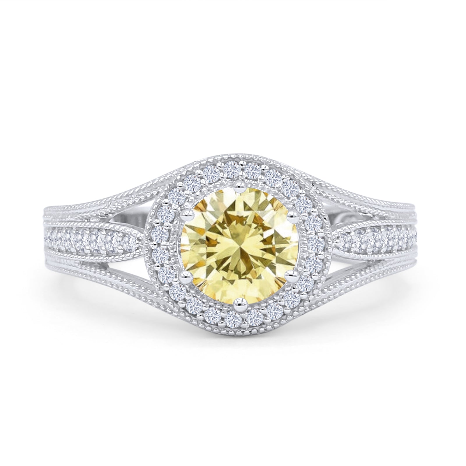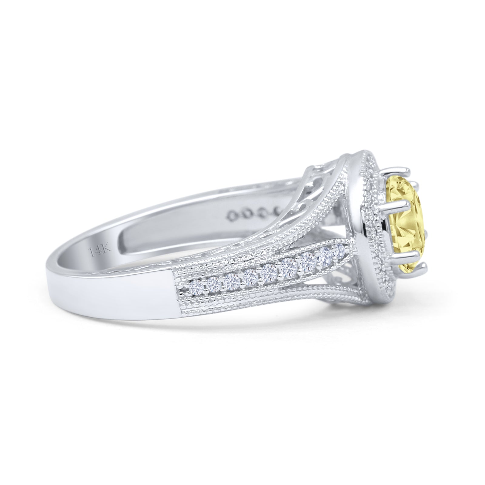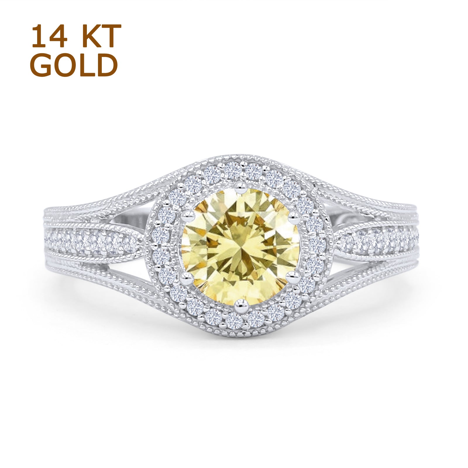 14K White Gold Art Deco Round Halo Split Shank Yellow CZ Bridal Ring