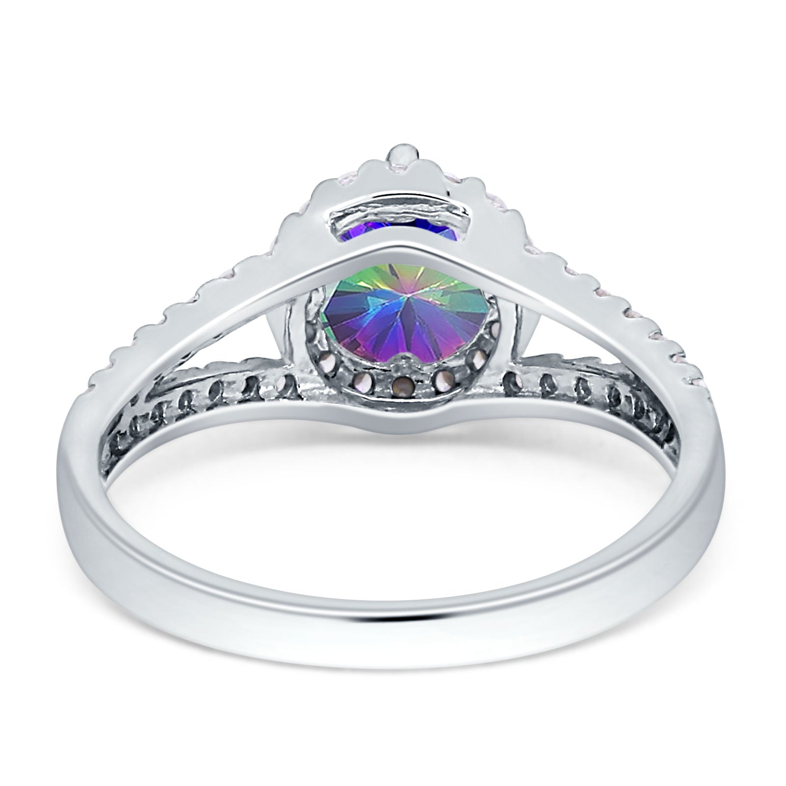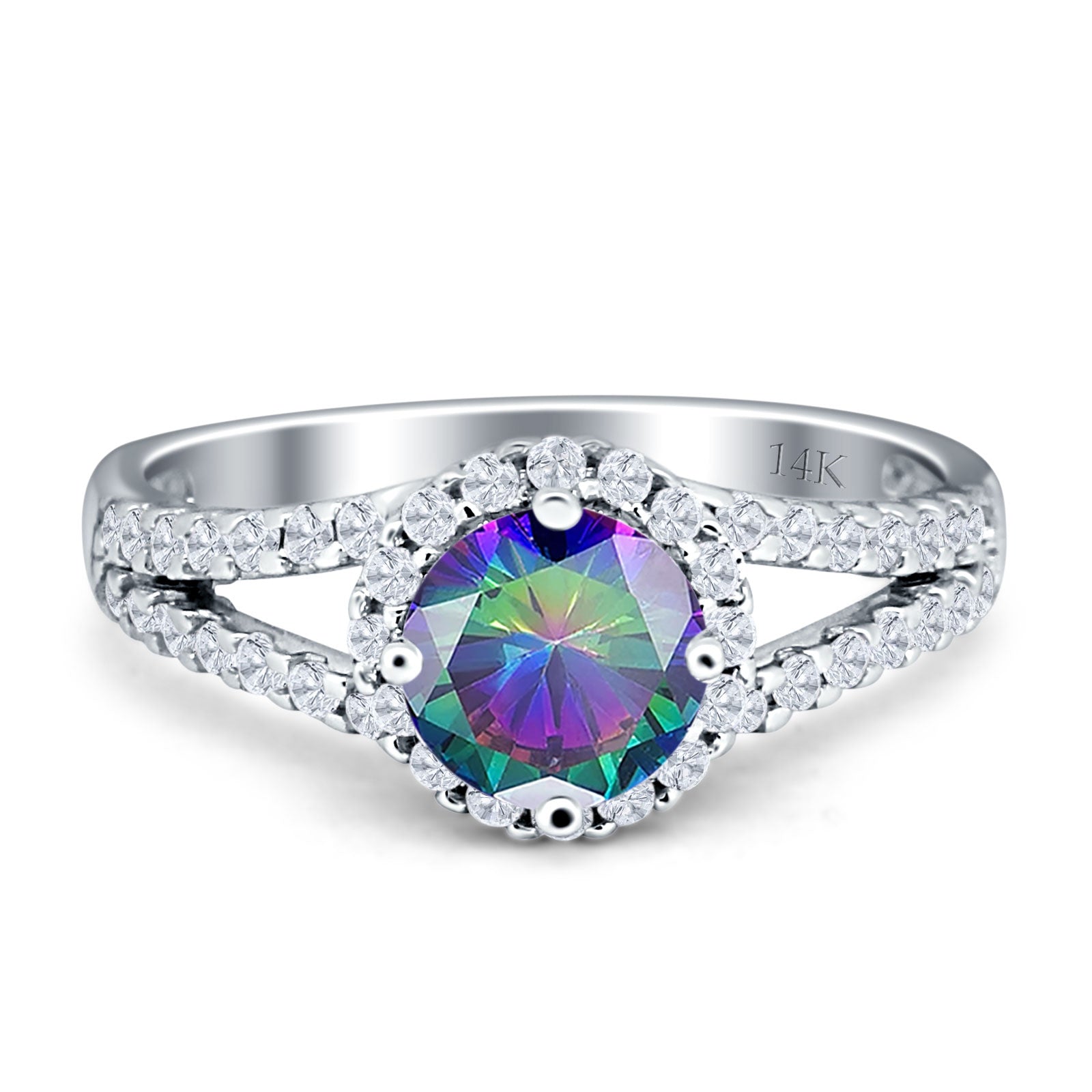 14K White Gold Art Deco Round Rainbow CZ Halo Split Shank Ring