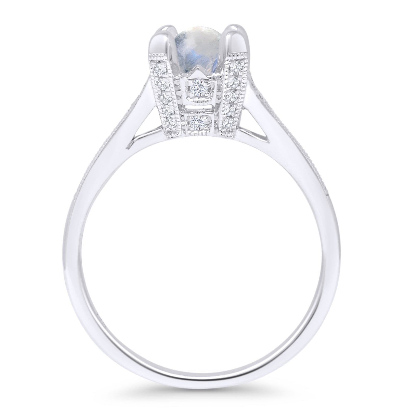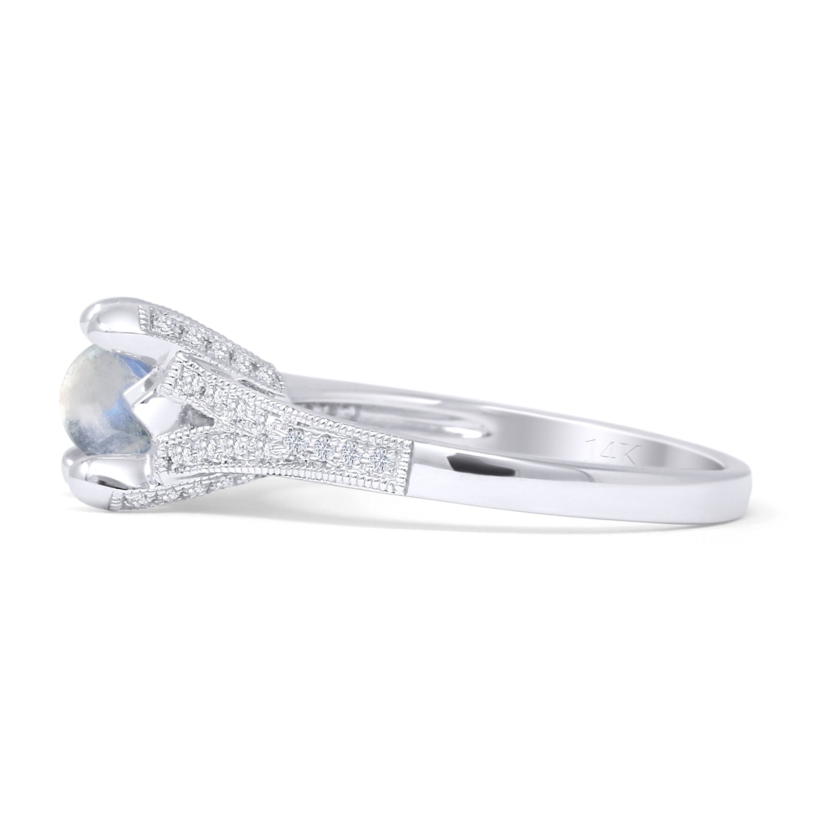 14K White Gold Round Natural Moonstone Split Shank Diamond Ring