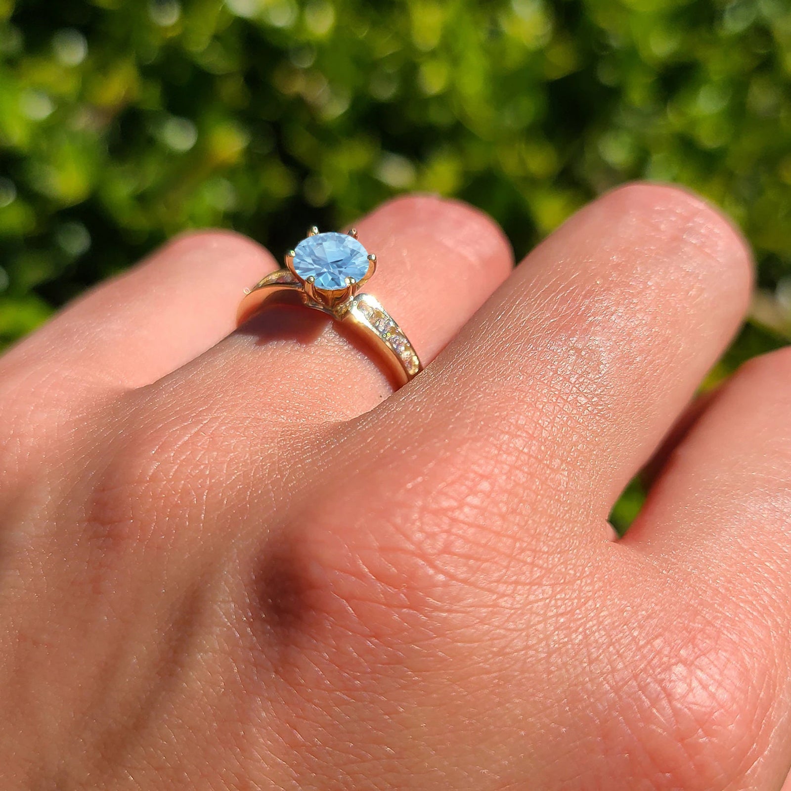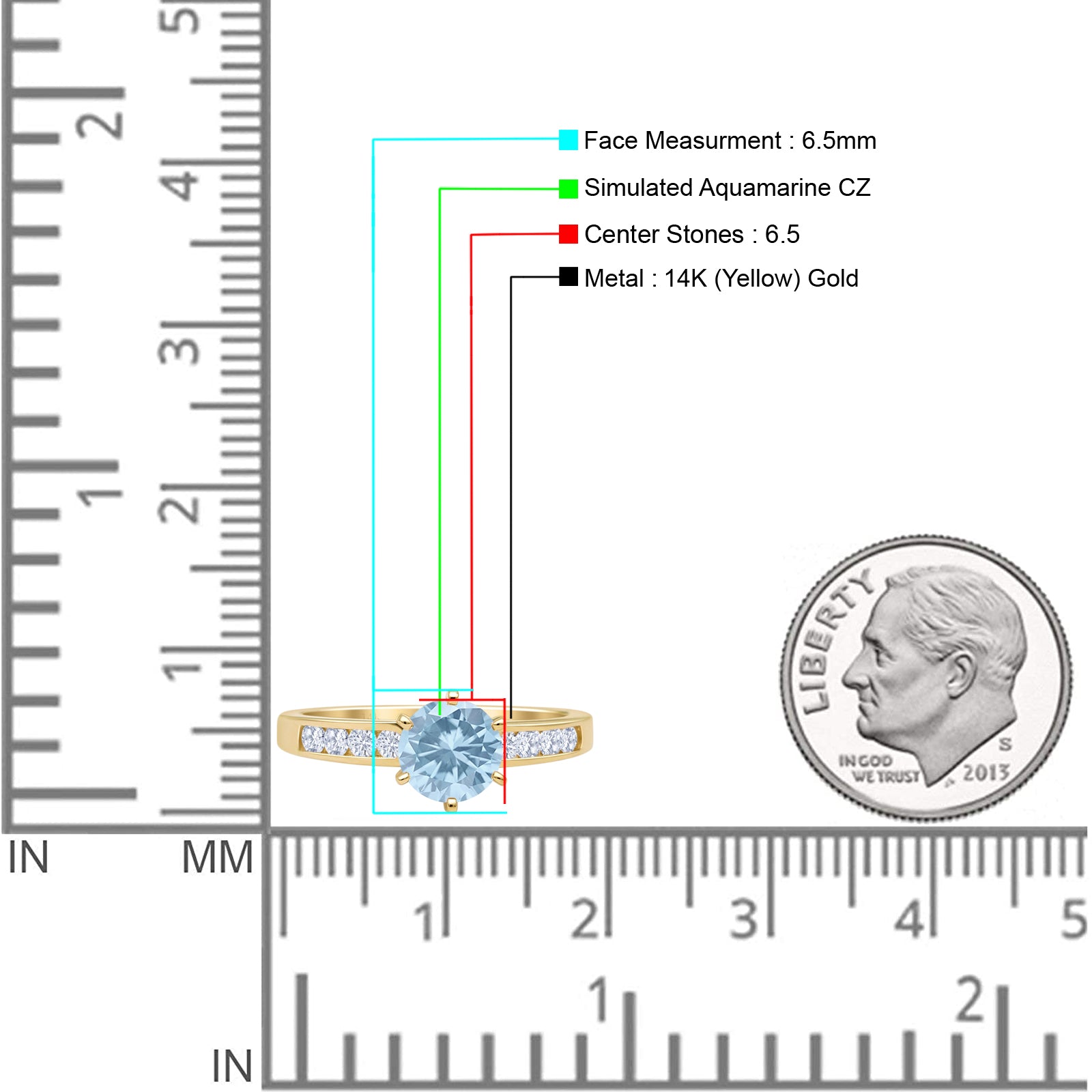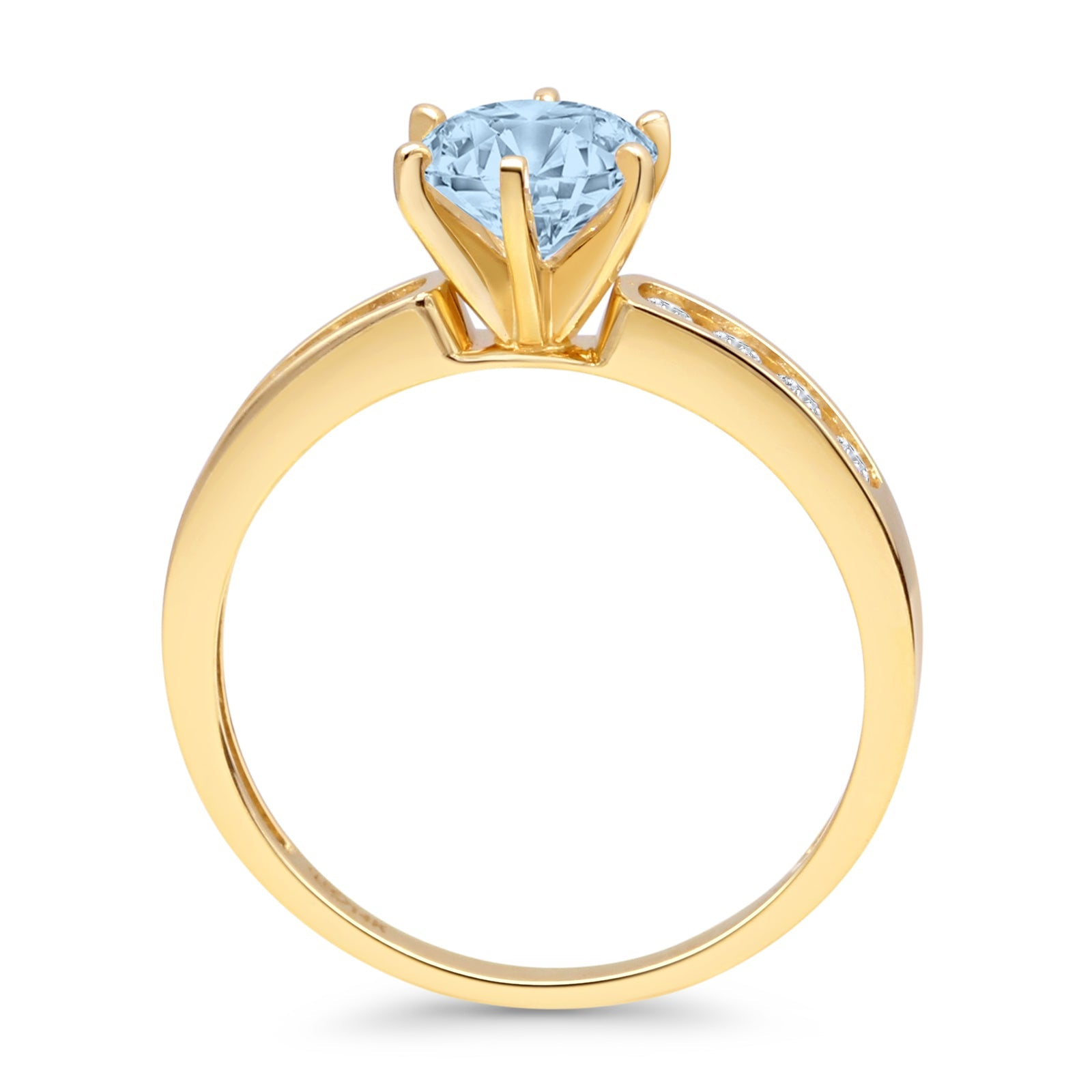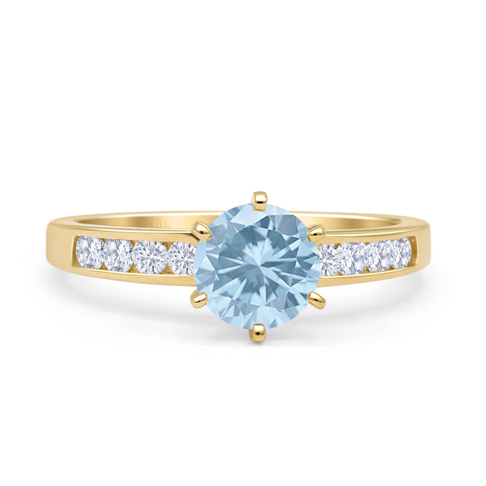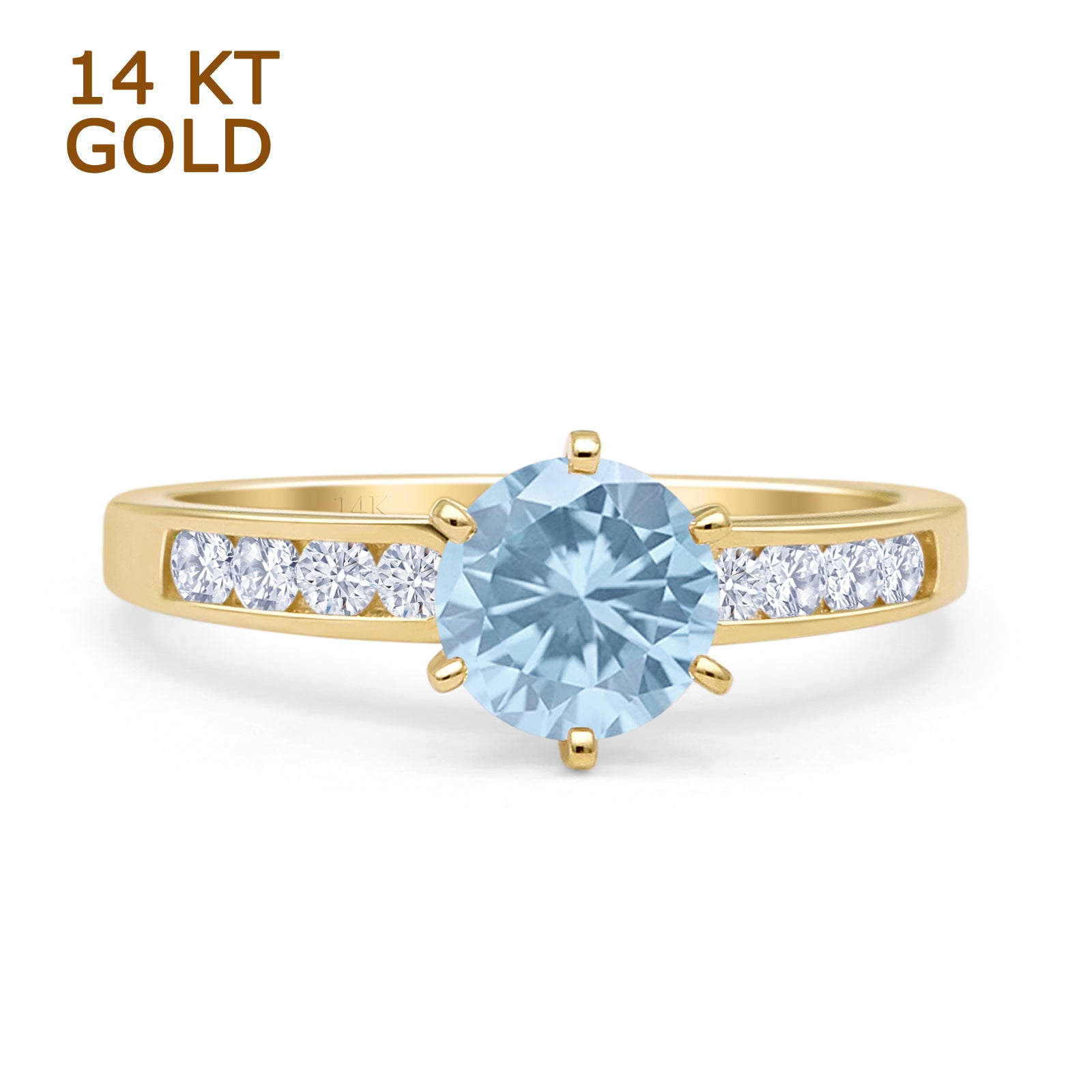 14K Yellow Gold Round Aquamarine CZ Cathedral Ring