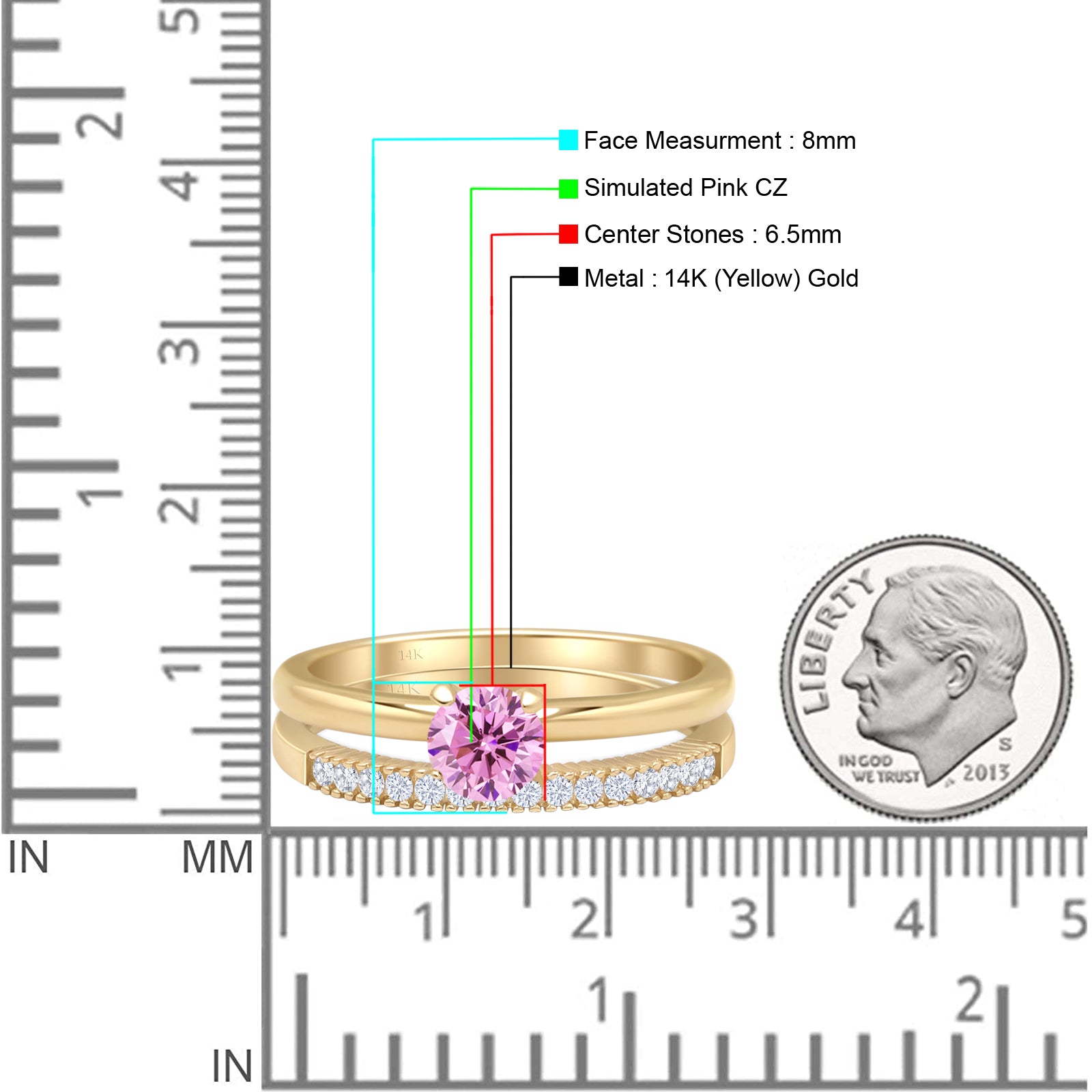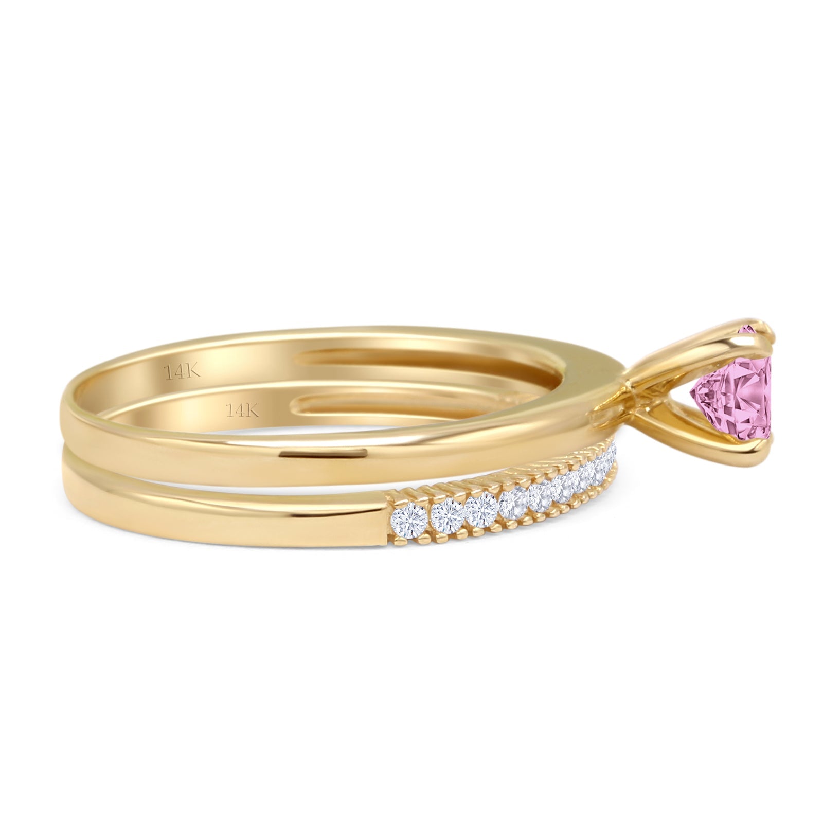 14K Yellow Gold Two Piece Round Solitaire Half Eternity Band Pink CZ Bridal Ring