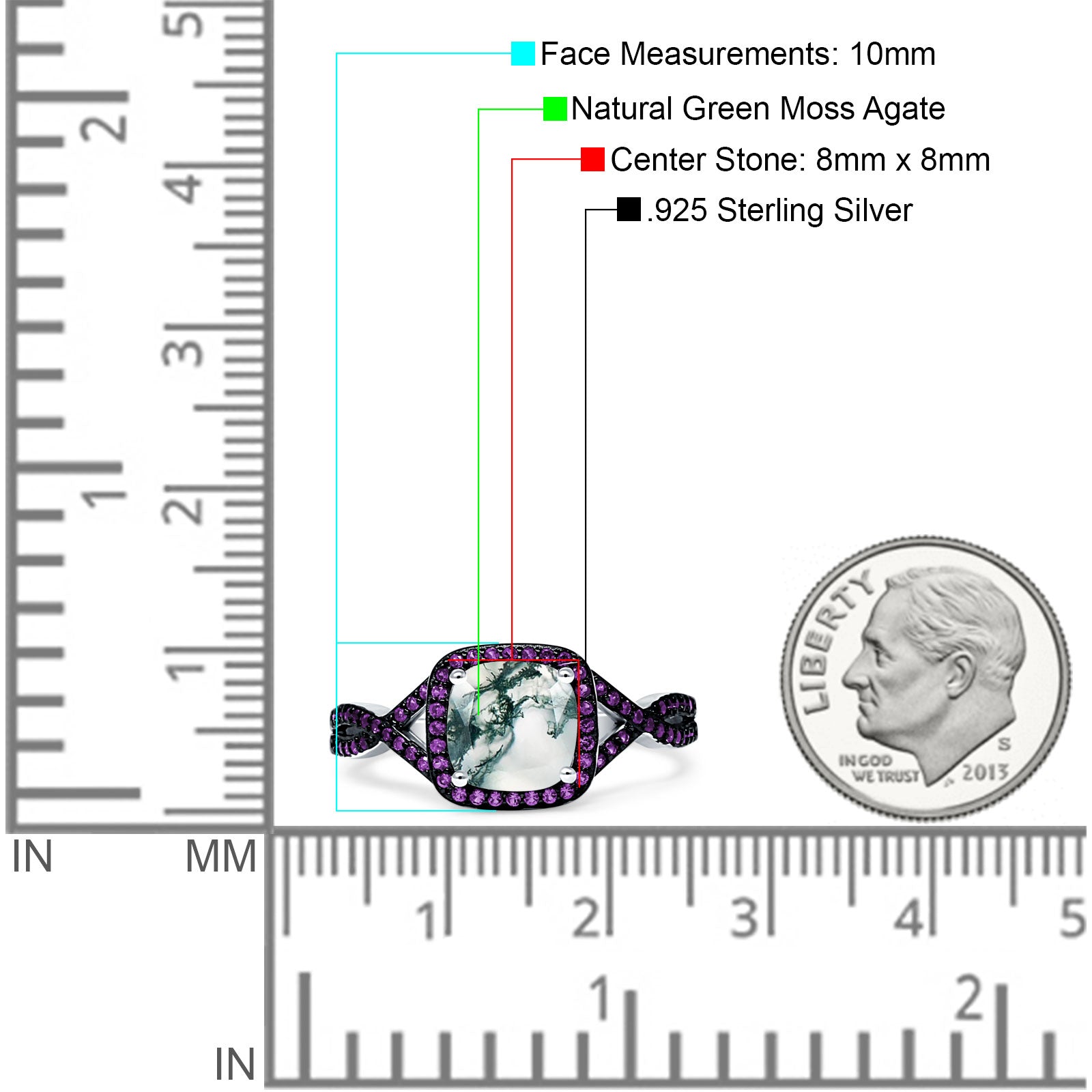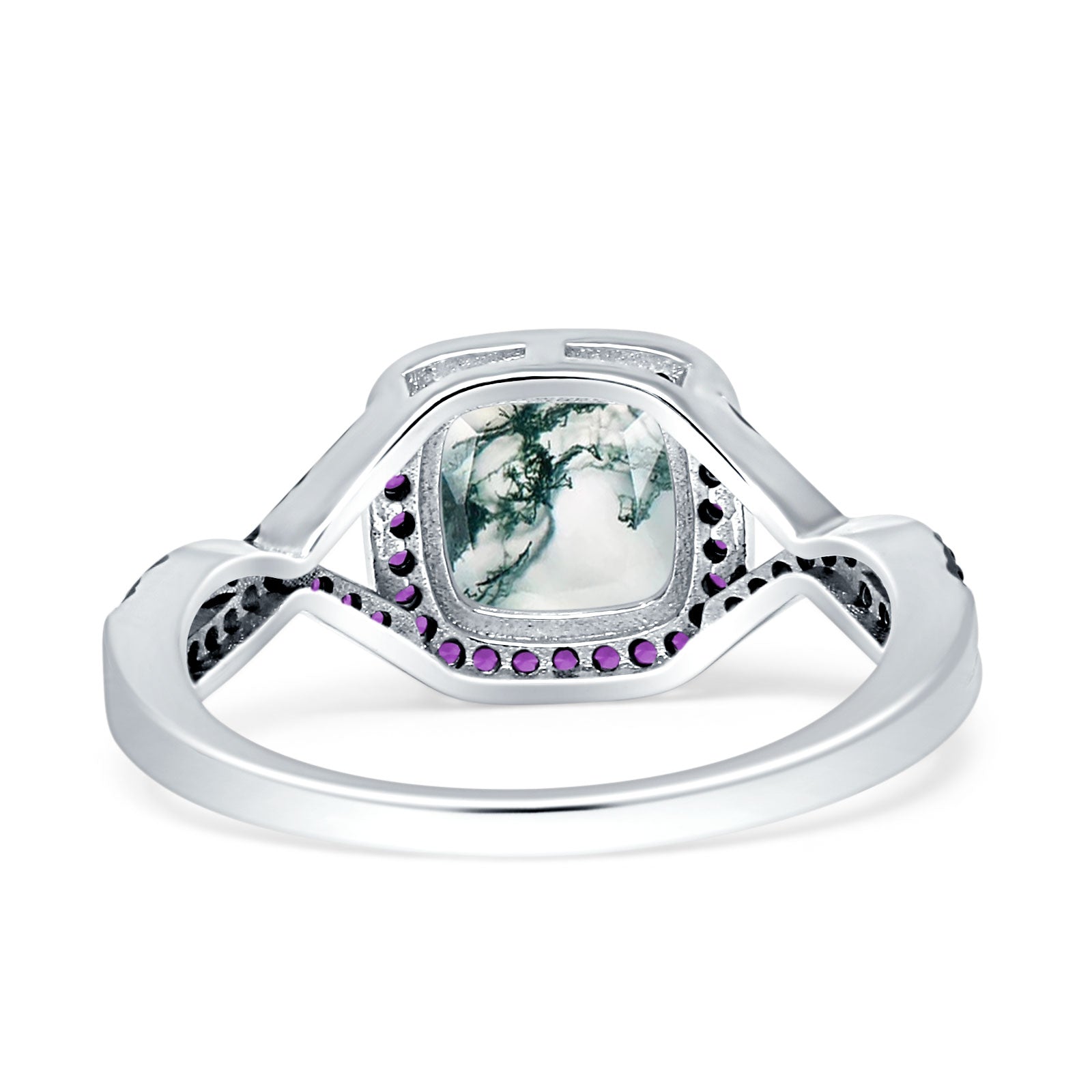 Art Deco Cushion Cut Halo Natural Green Moss Agate Side Stone Amethyst CZ Ring 925 Sterling Silver