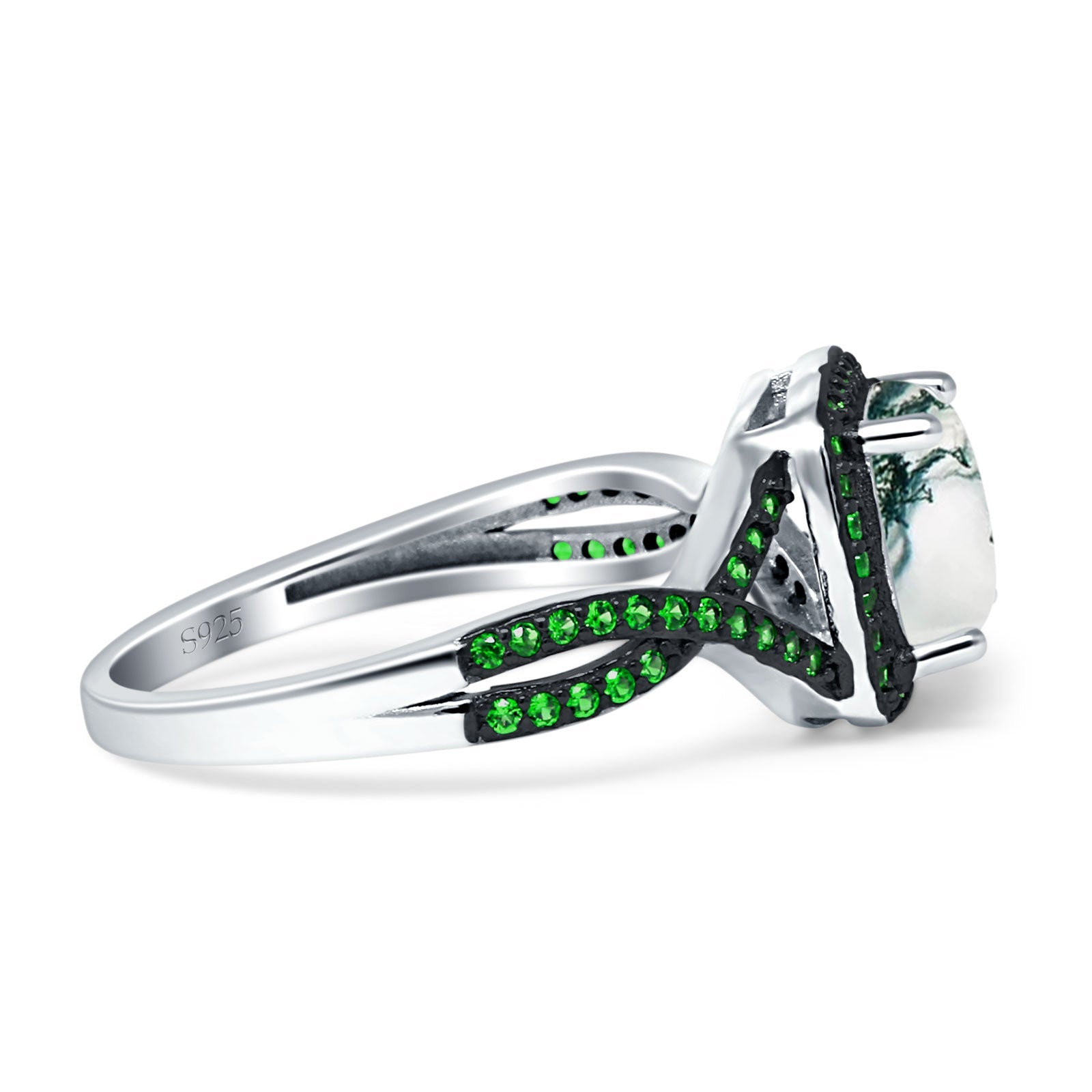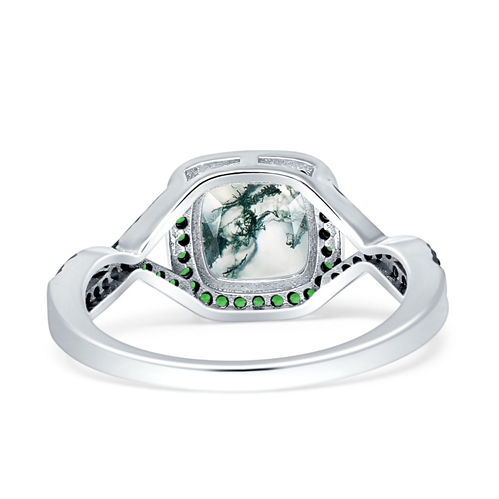 Art Deco Cushion Cut Halo Natural Green Moss Agate Side Stone Green Emerald CZ Ring 925 Sterling Silver