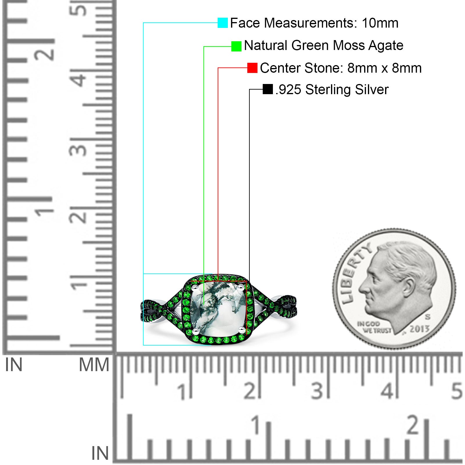 Side Stone: Green Emerald CZ.