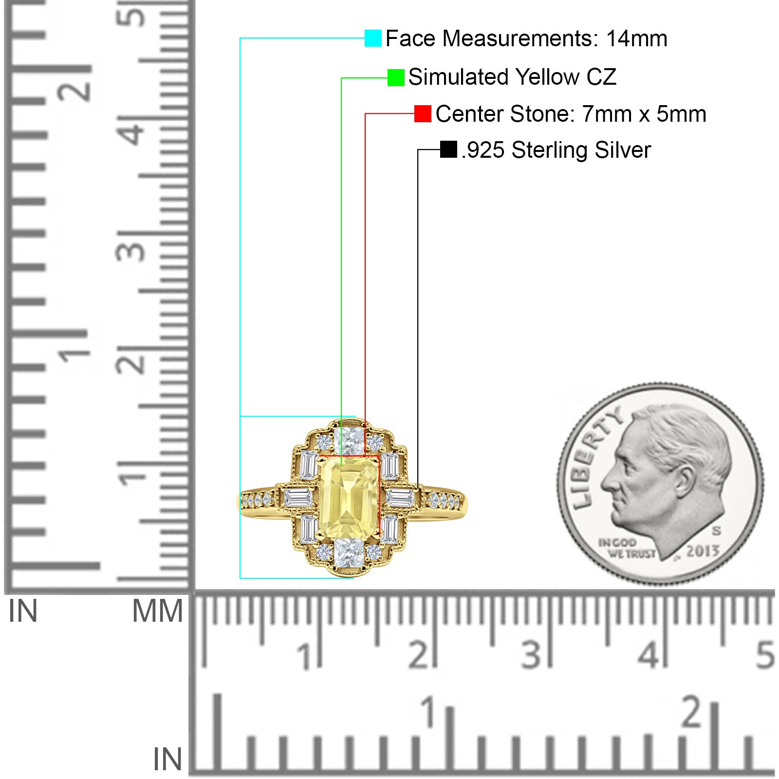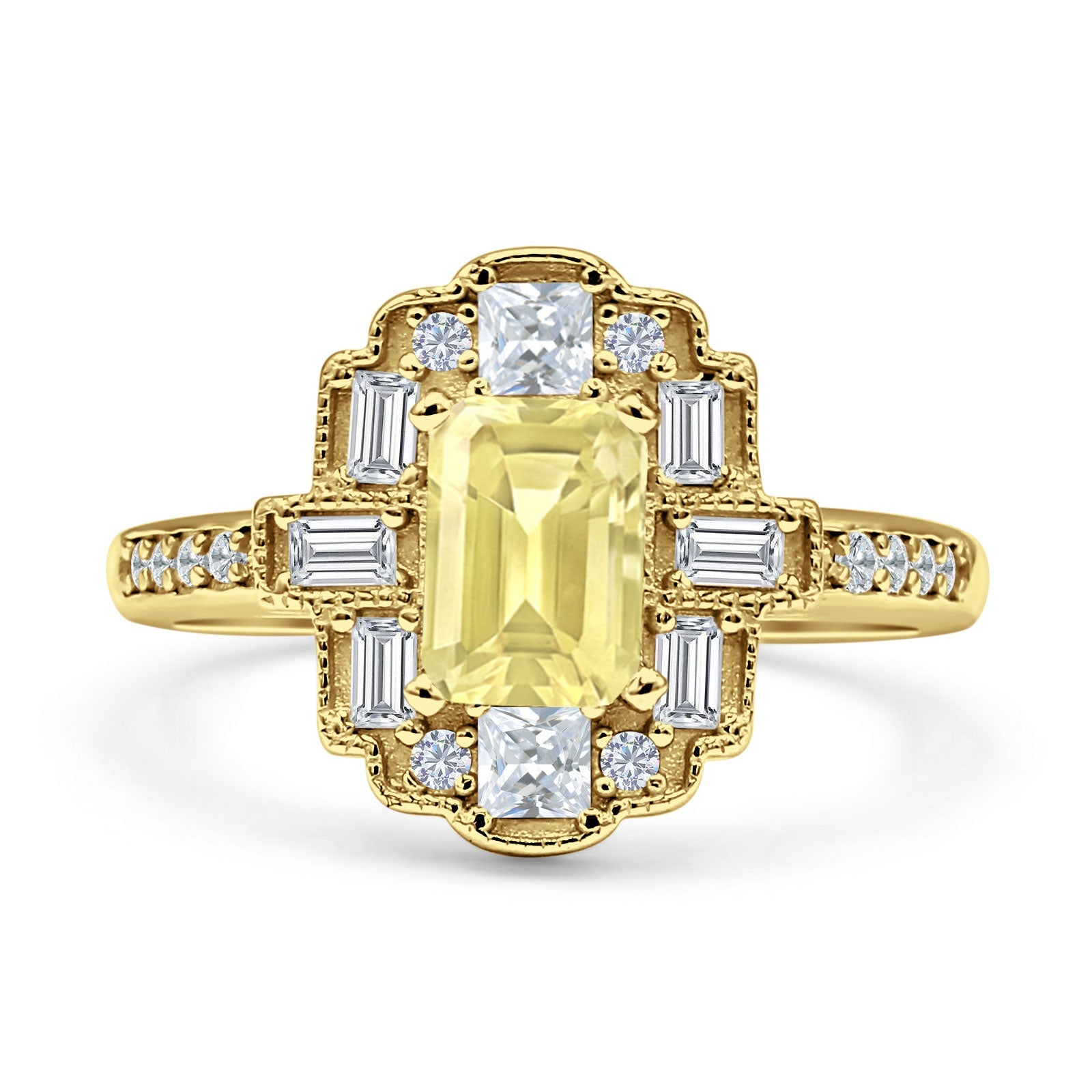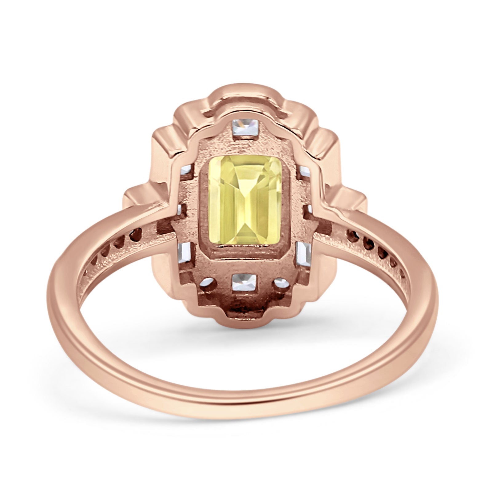 Art Deco Emerald Cut Yellow CZ Floral Cocktail Ring 925 Sterling Silver