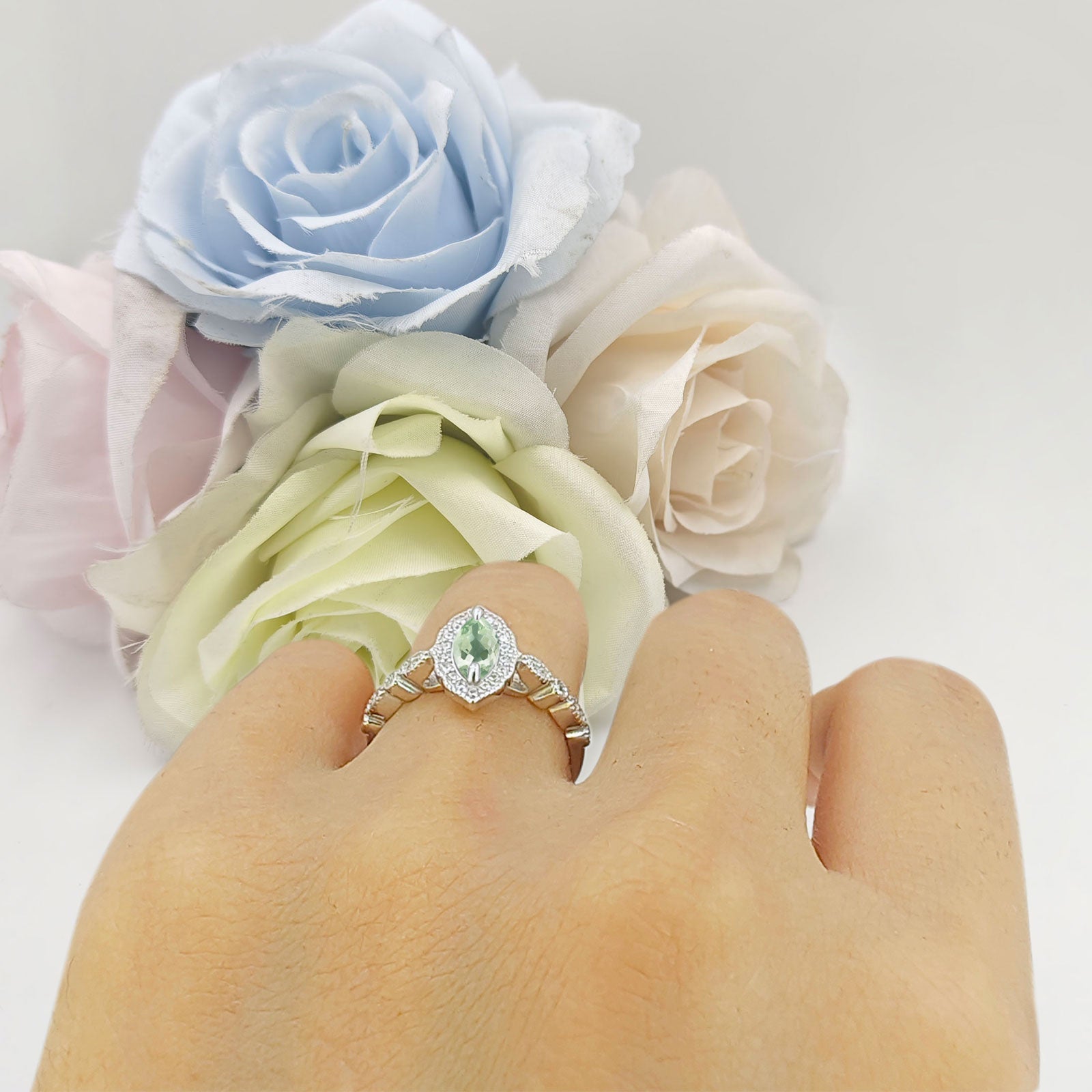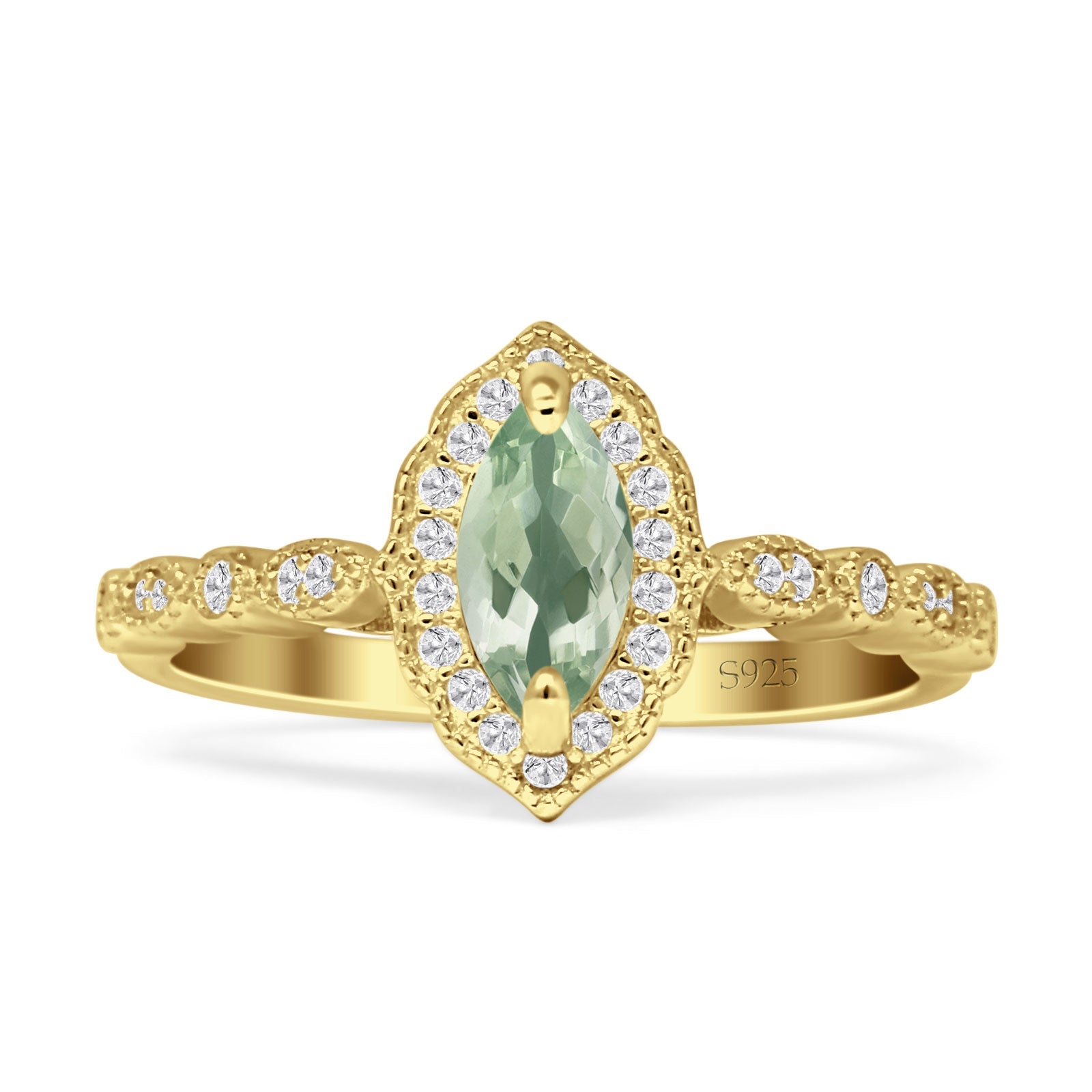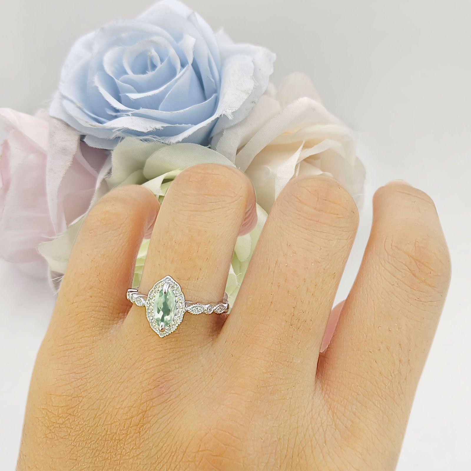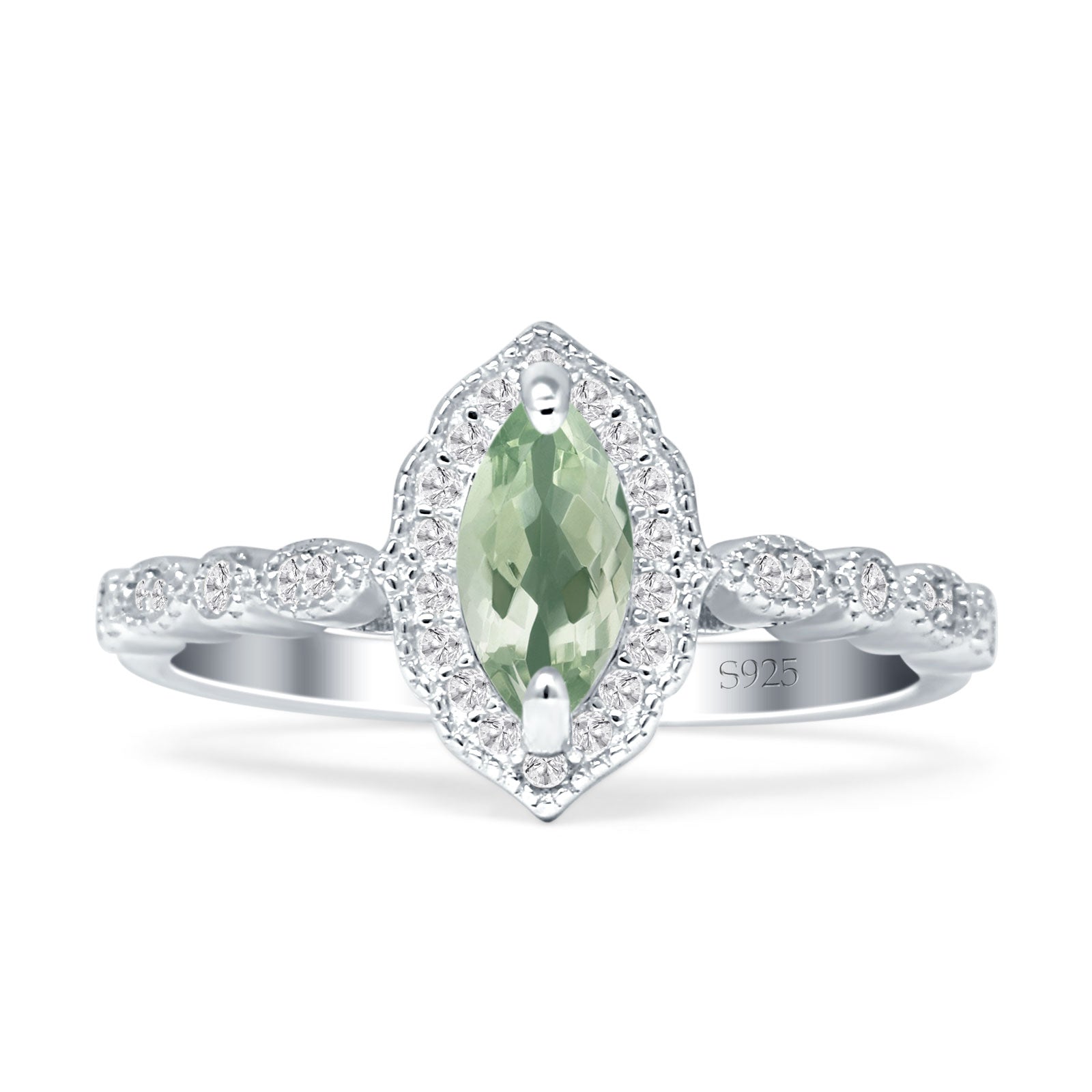 Art Deco Engagement Ring Halo Marquise Natural Green Amethyst Prasiolite 925 Sterling Silver