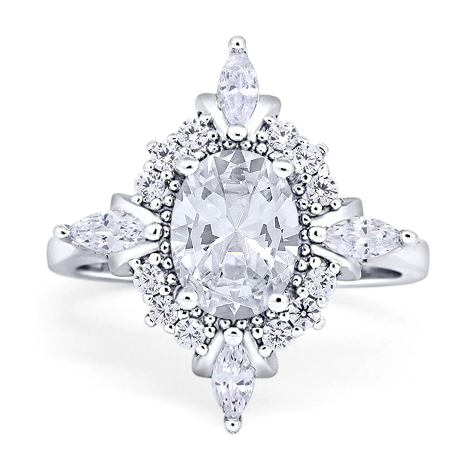 Art Deco Oval Moissanite Marquise Style Beaded Ring 925 Sterling Silver