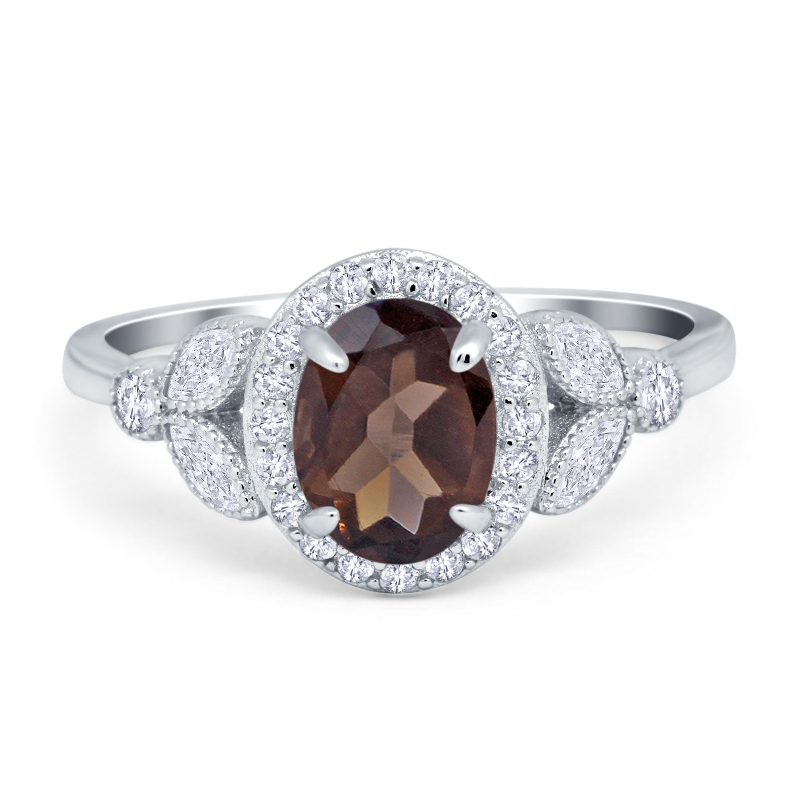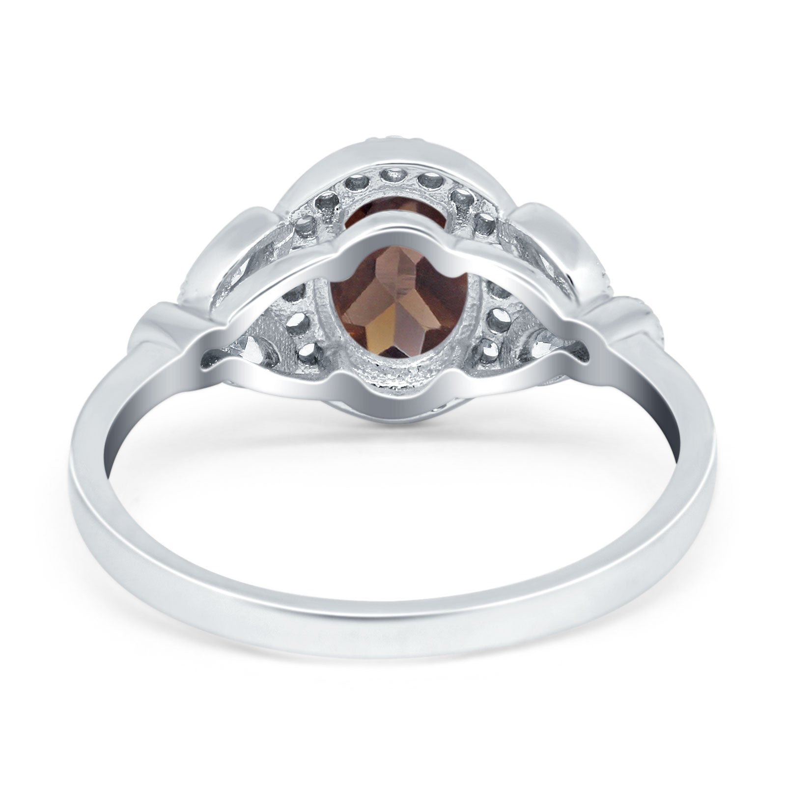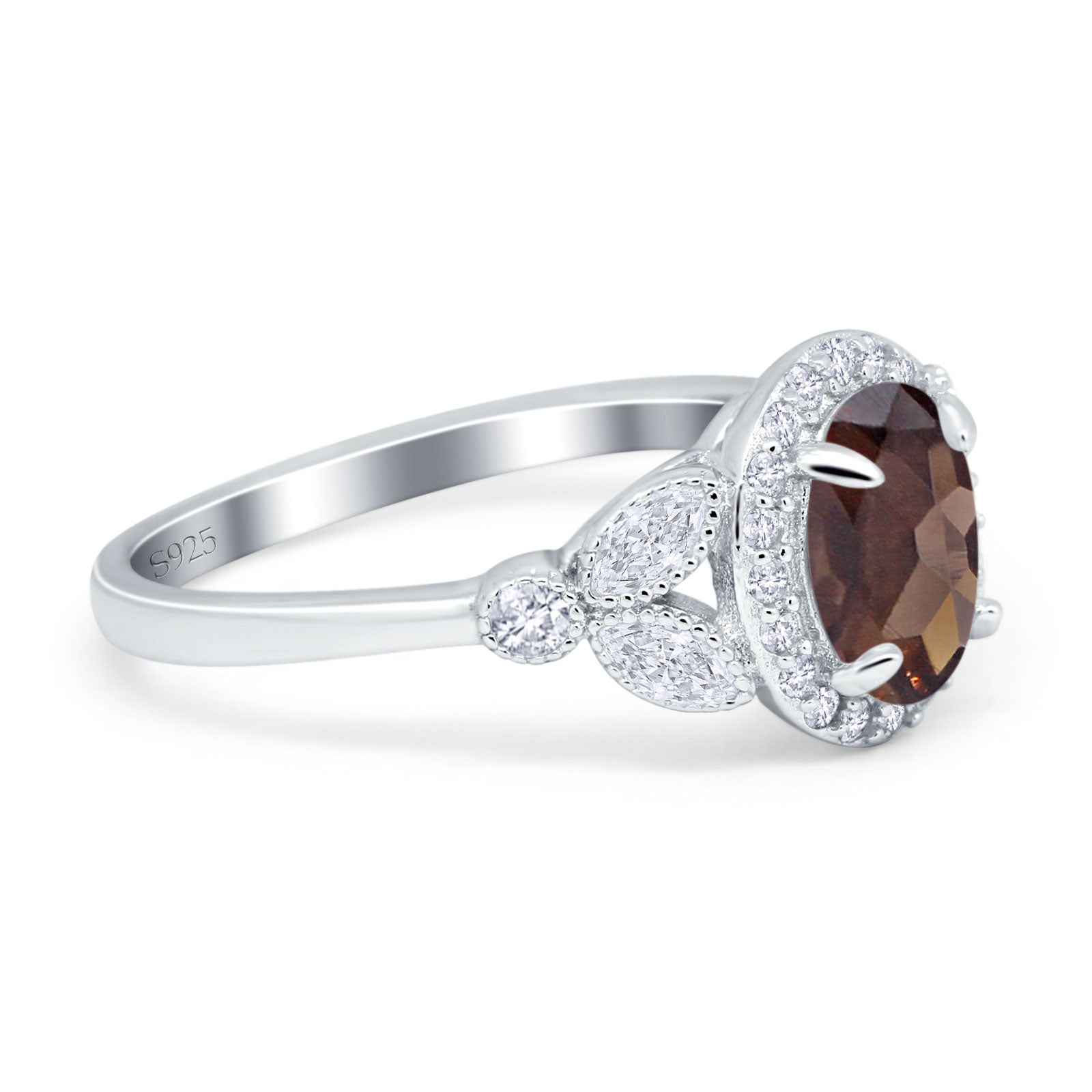 Art Deco Oval Natural Chocolate Smoky Quartz Halo Leaf Accent Ring 925 Sterling Silver