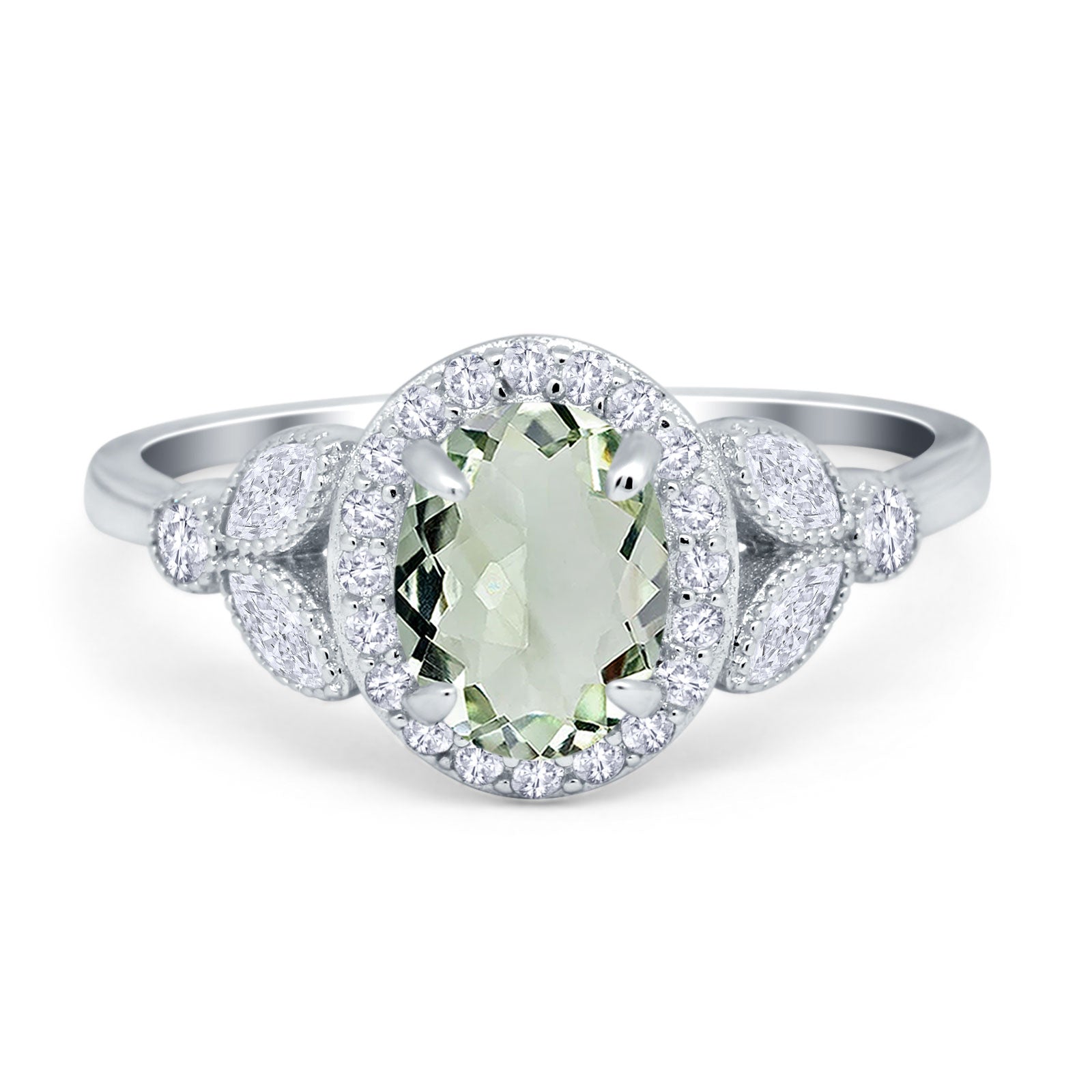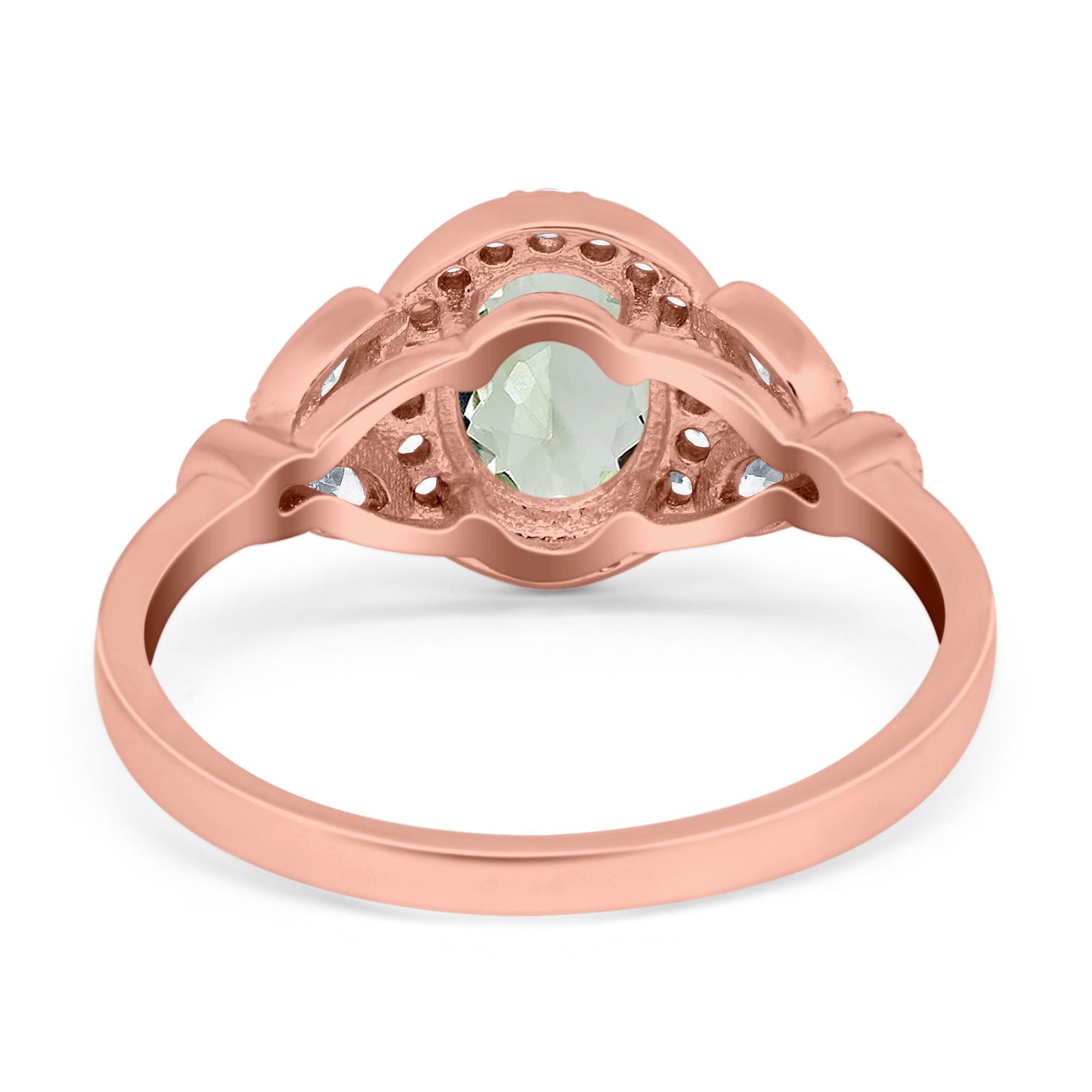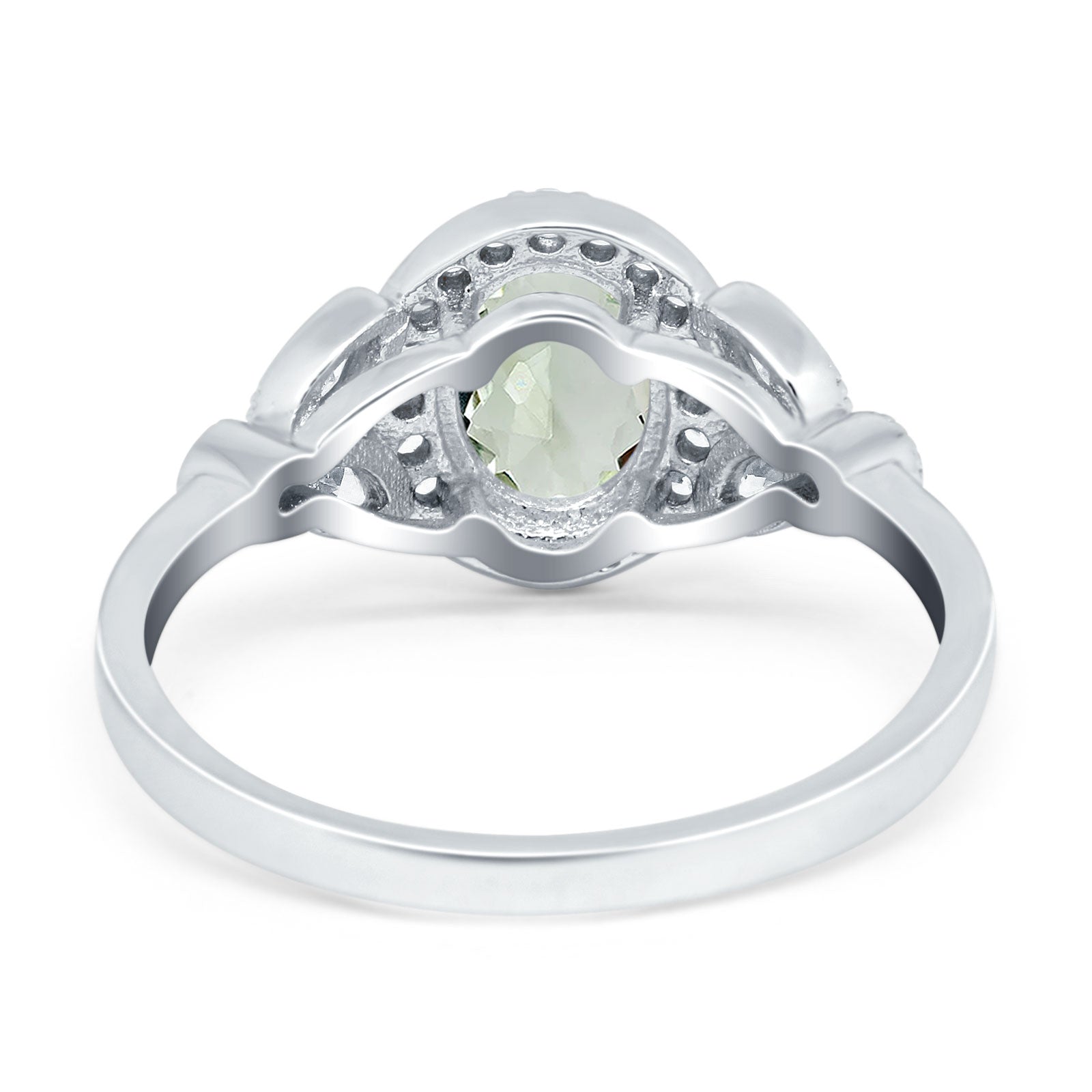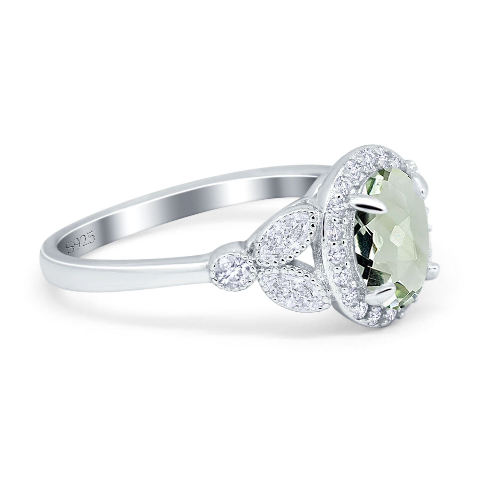 Art Deco Oval Natural Green Amethyst Prasiolite Halo Leaf Accent Ring 925 Sterling Silver