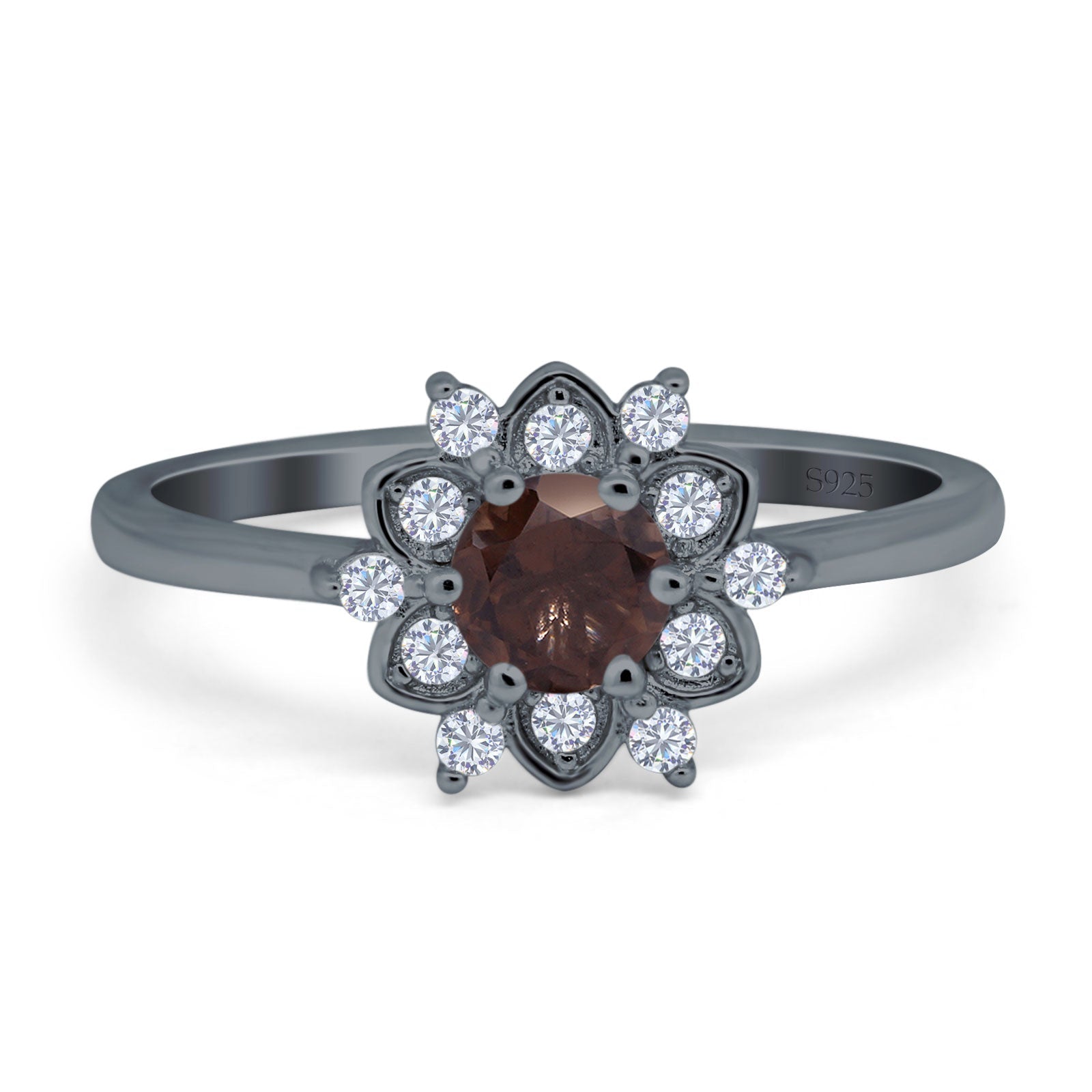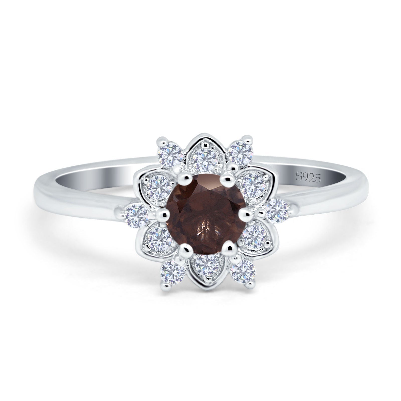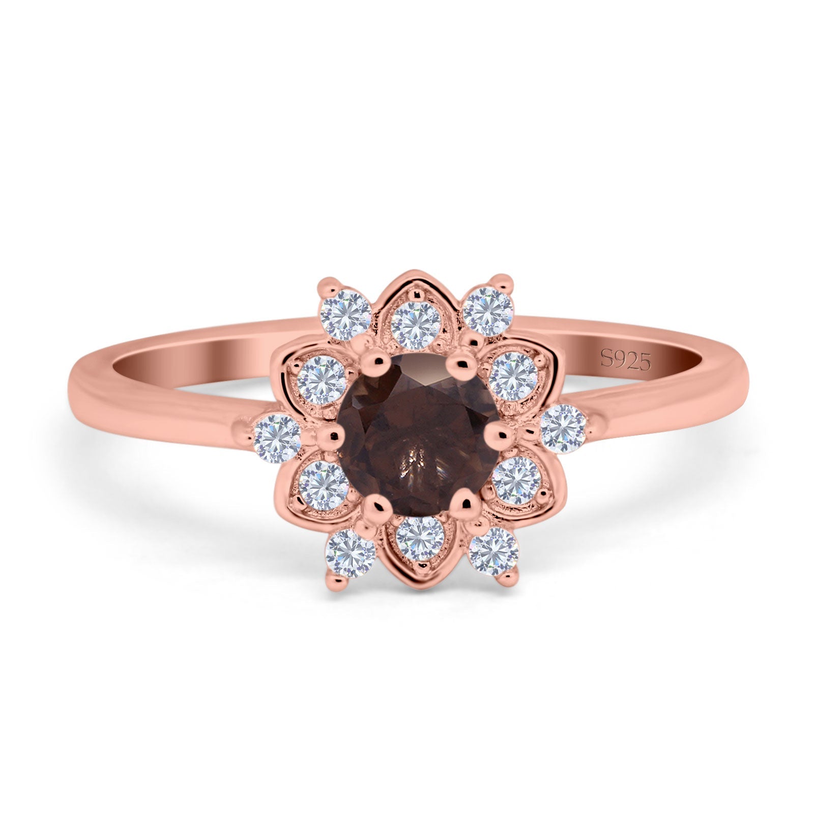 Art Deco Round Natural Chocolate Smoky Quartz Flower Design Ring 925 Sterling Silver