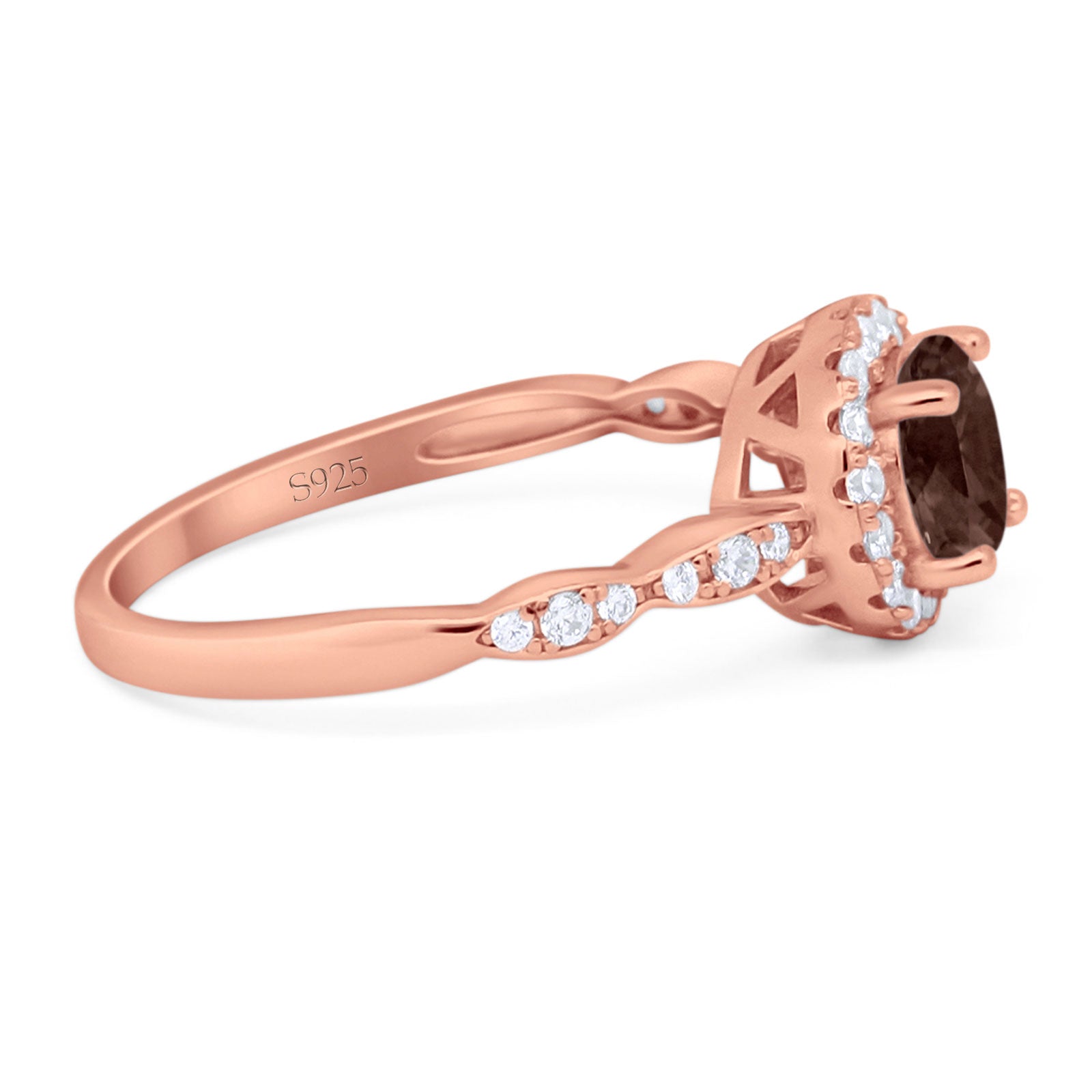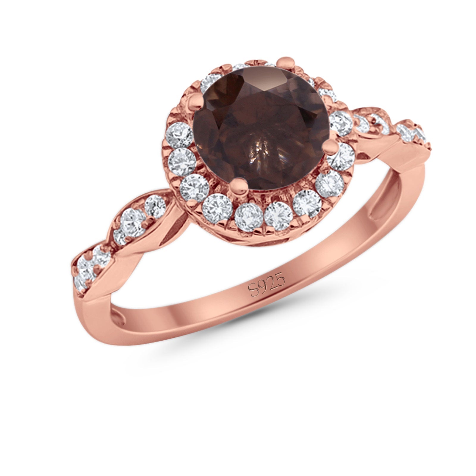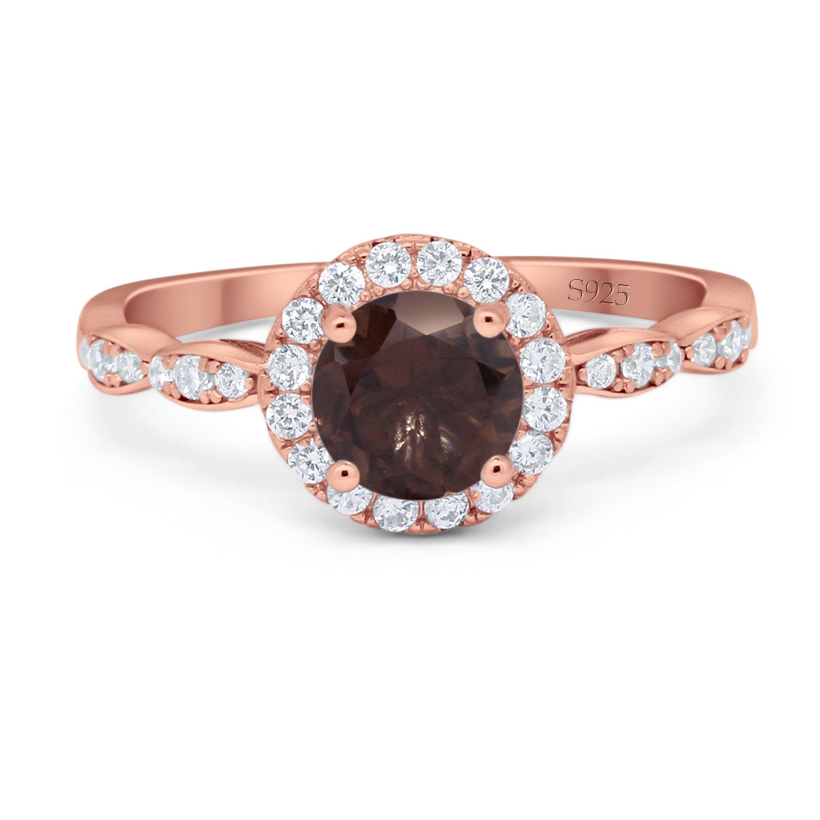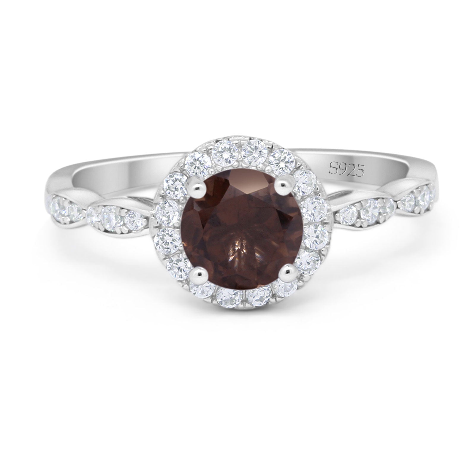 Art Deco Round Natural Chocolate Smoky Quartz Halo Engagement Ring 925 Sterling Silver