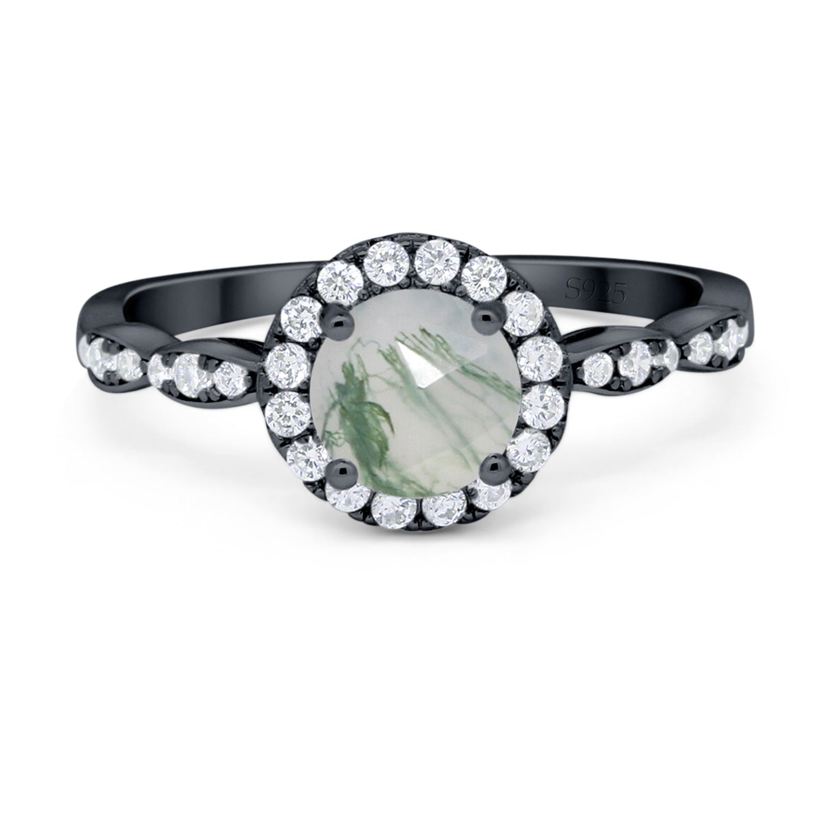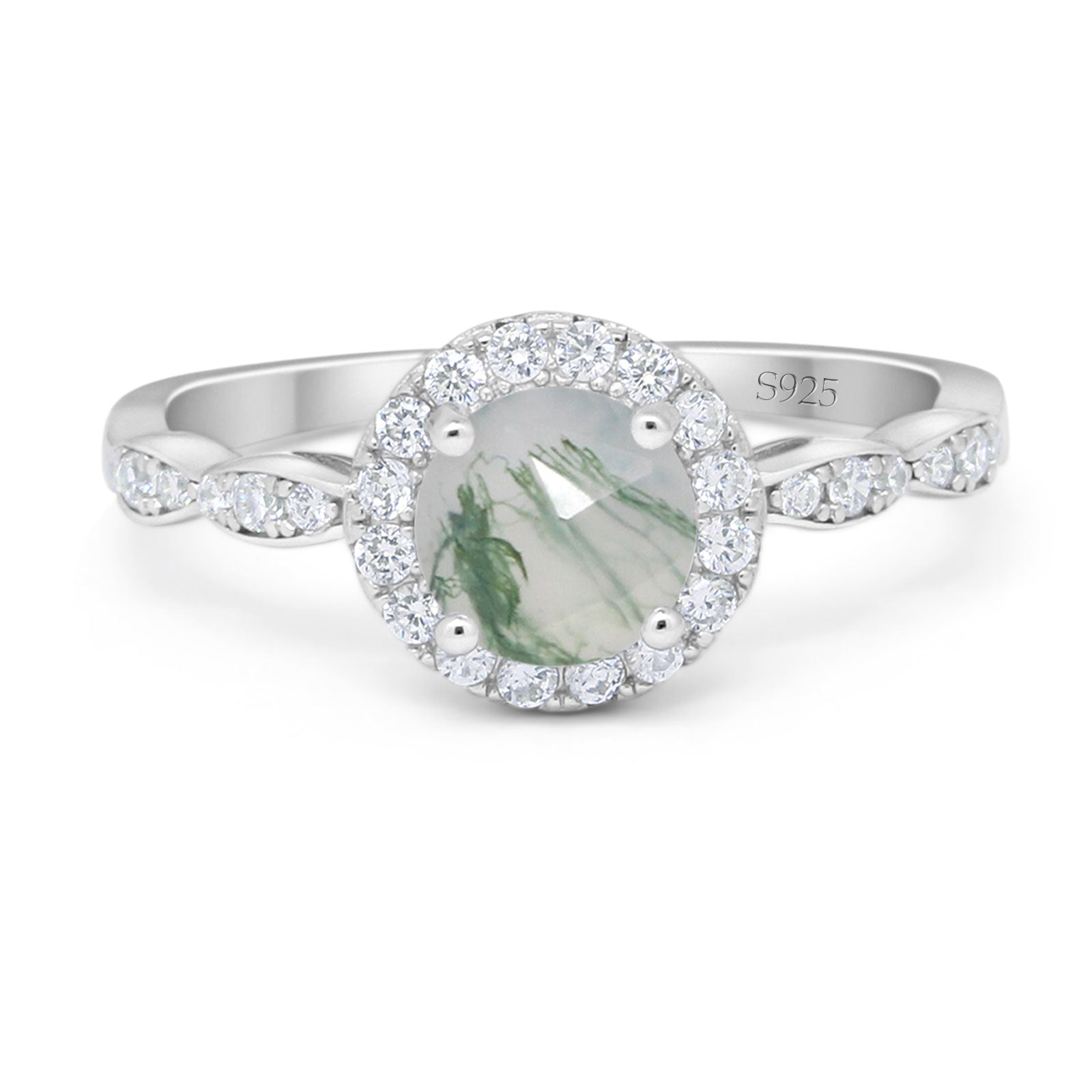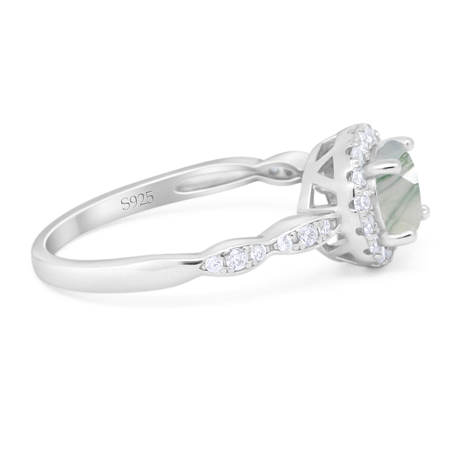 Art Deco Round Natural Green Moss Agate Halo Engagement Ring 925 Sterling Silver