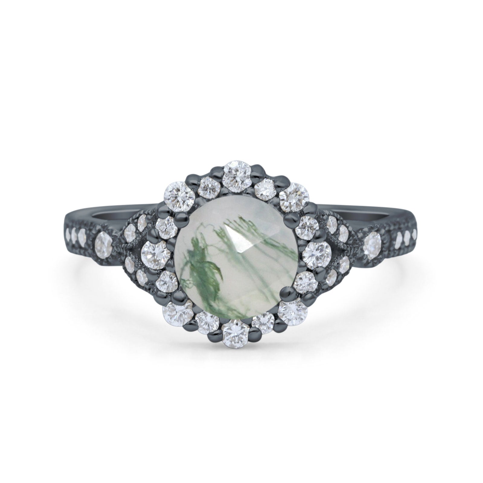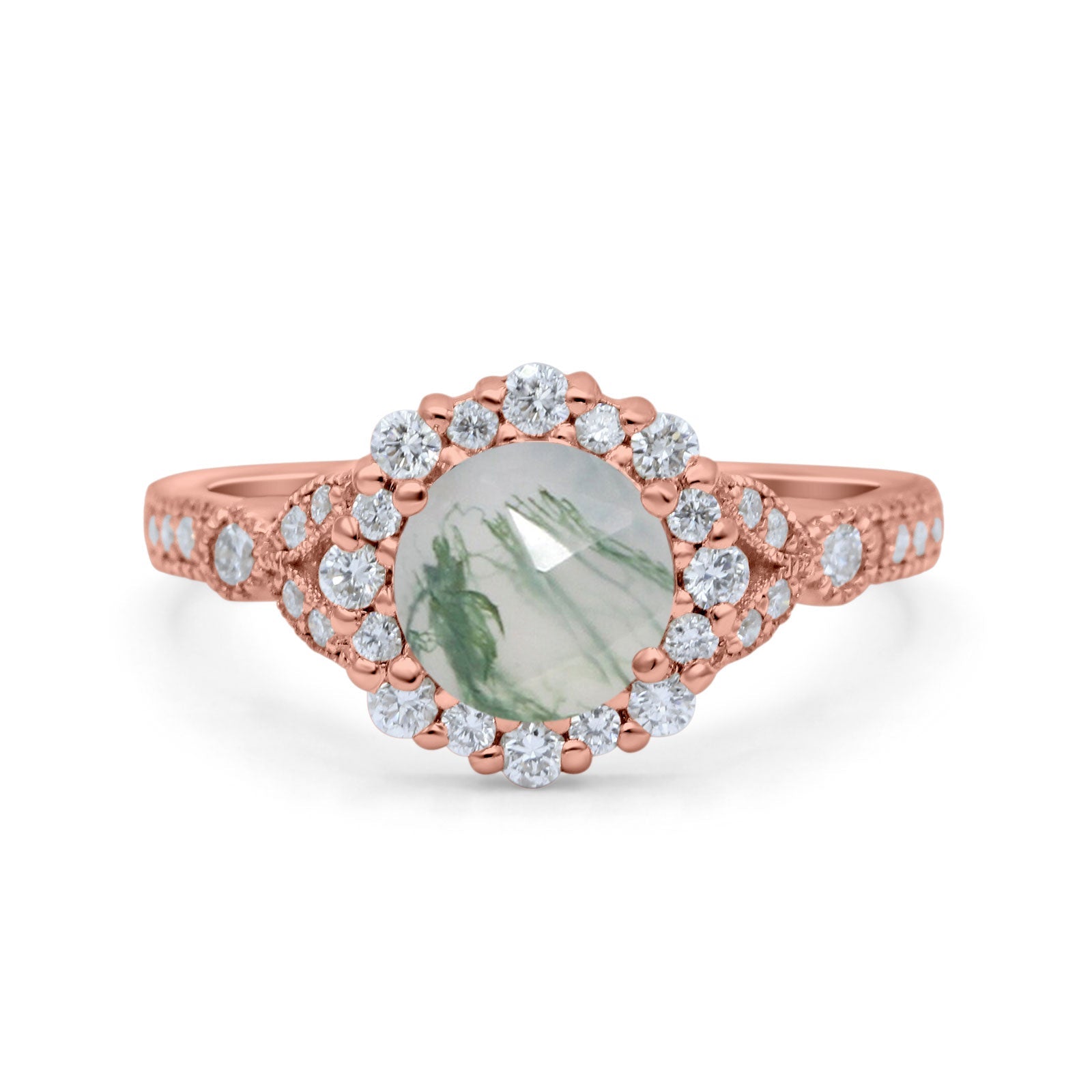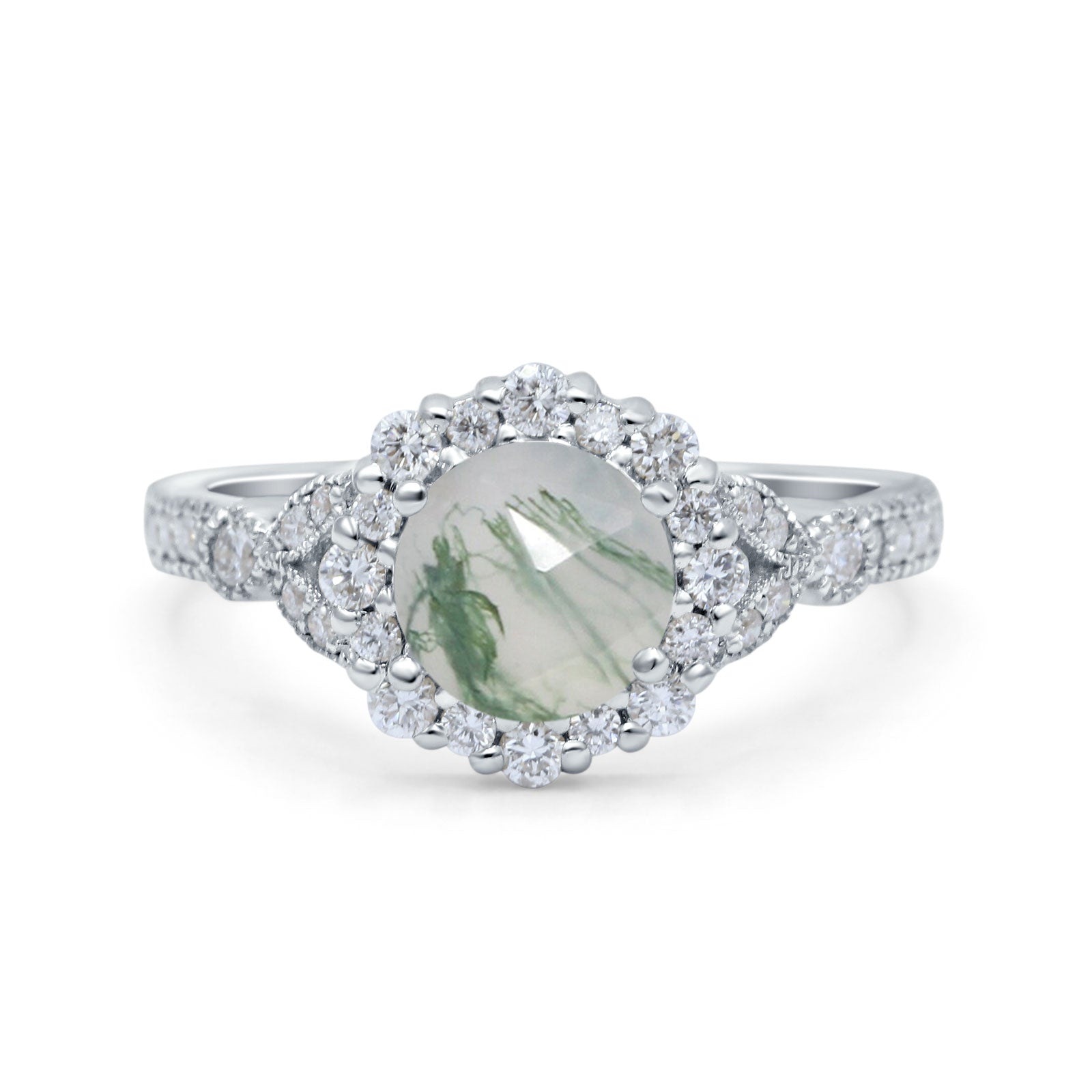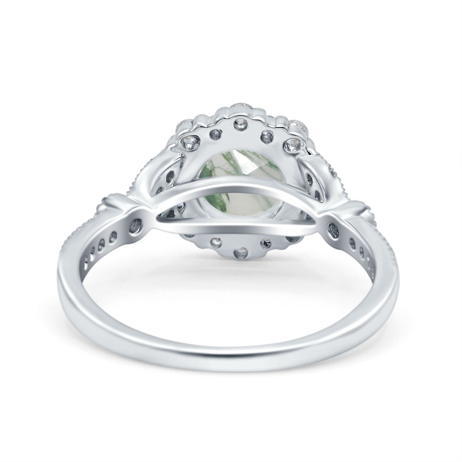 Art Deco Round Natural Green Moss Agate Halo Engagement Rings 925 Sterling Silver